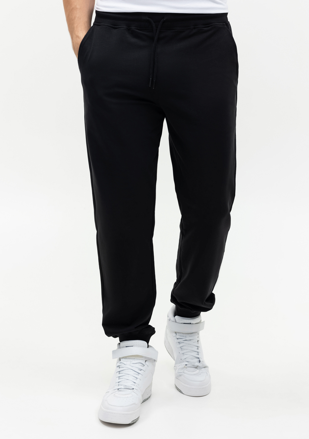Мужские брюки свободного силуэта с эластичным поясом и прорезным карманом. Широкий пояс со шнурком в тон основному цвету обеспечивает удобную посадку на талии.