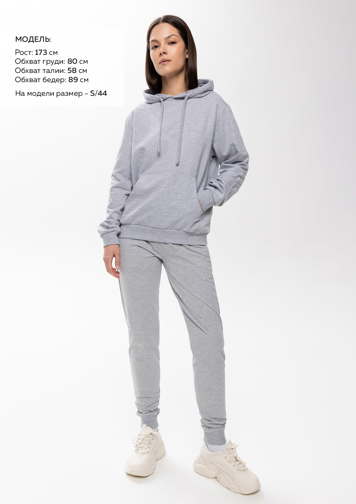 Размер женских брюк: S/44. Параметры модели: рост 173 см.; обхват груди 80 см.; обхват талии 58 см.; обхват бедер 89 см.