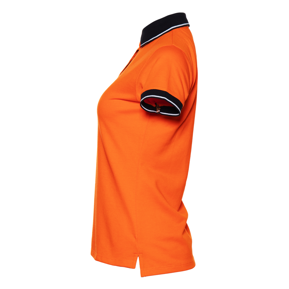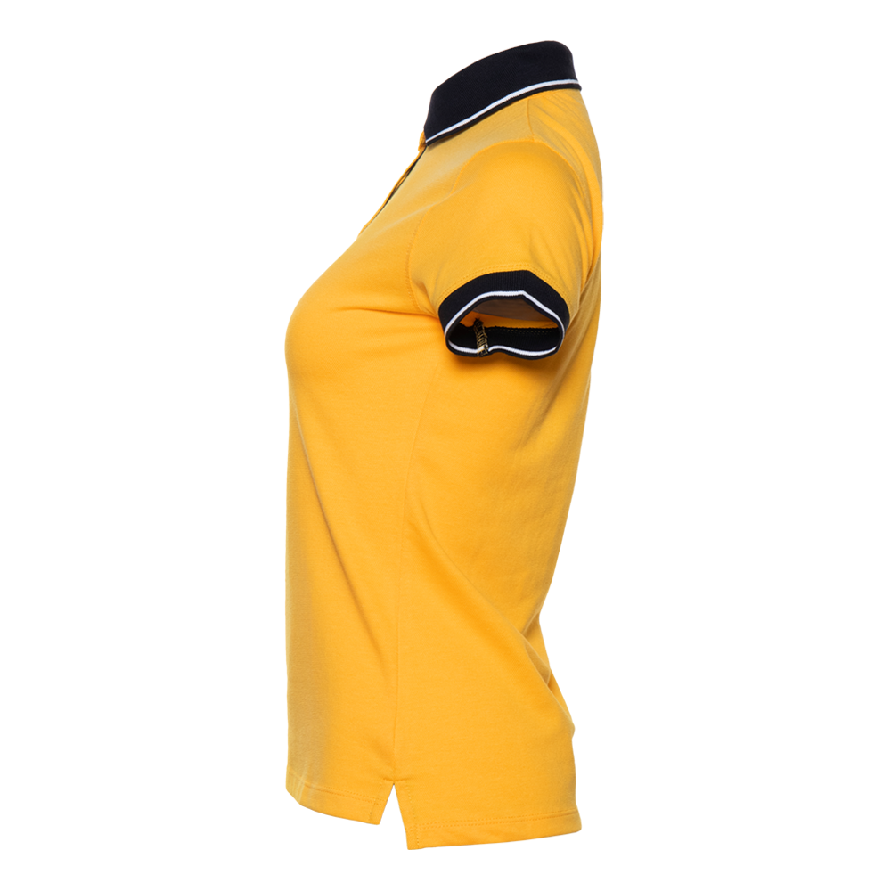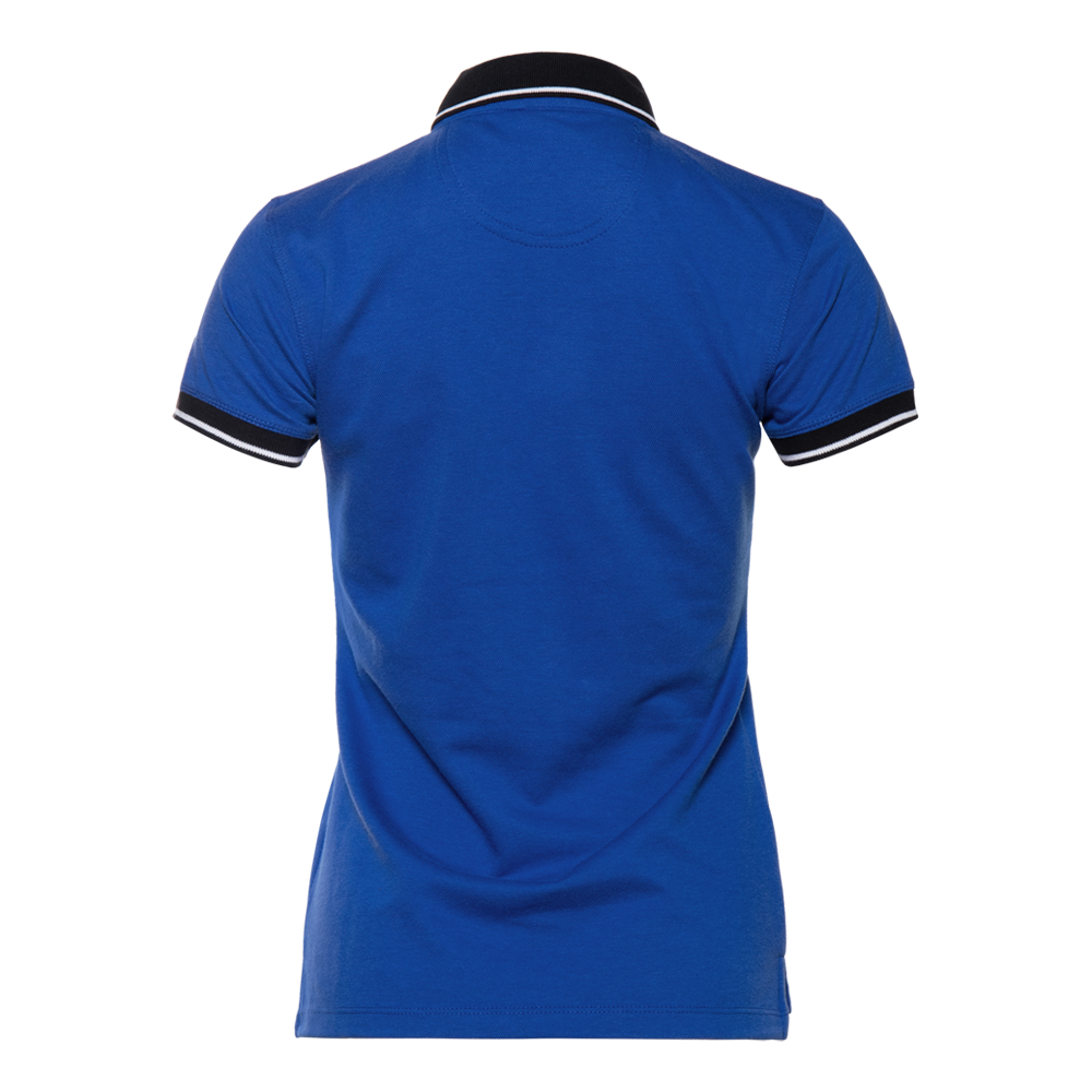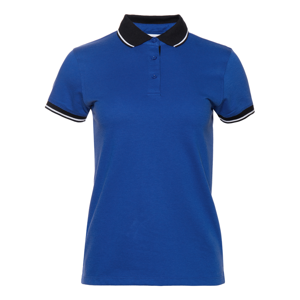Женская рубашка поло приталенного силуэта с контрастным отложным воротником и манжетом, втачным коротким рукавом и застежку на пуговицы. Асимметричный крой гарантирует свободу движения и защиту спины от продувания ветром.