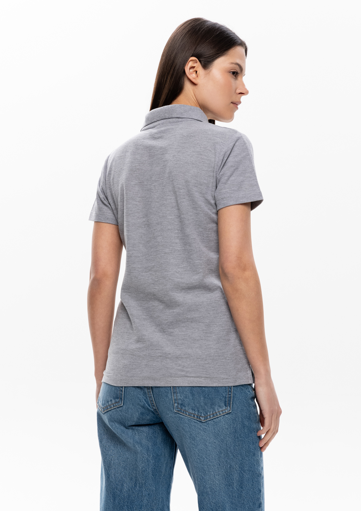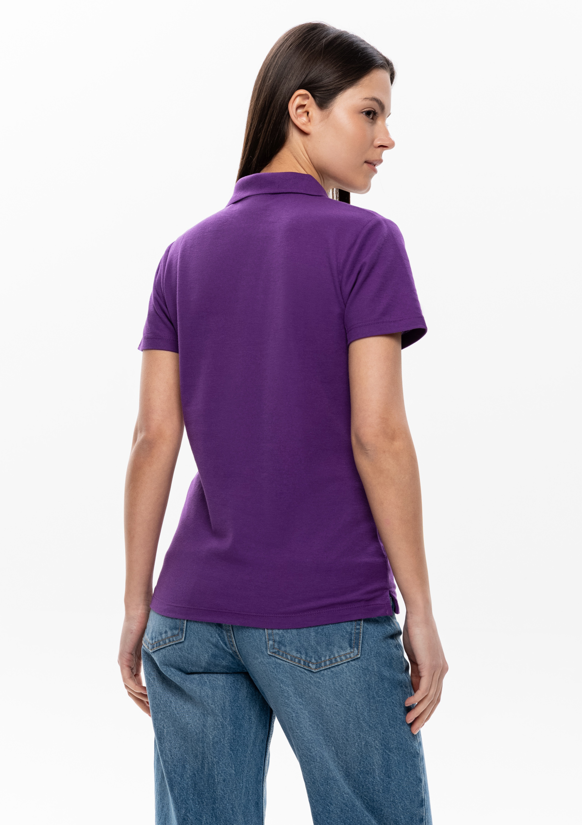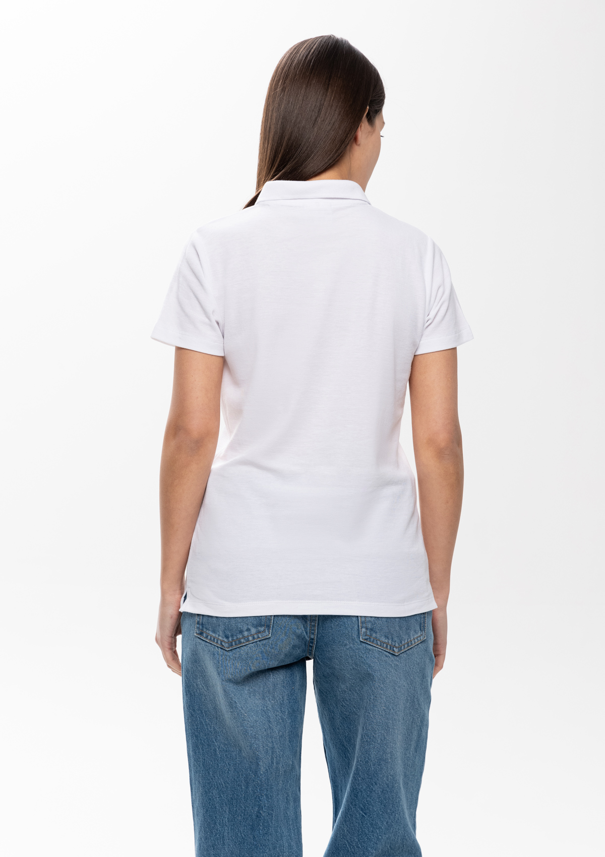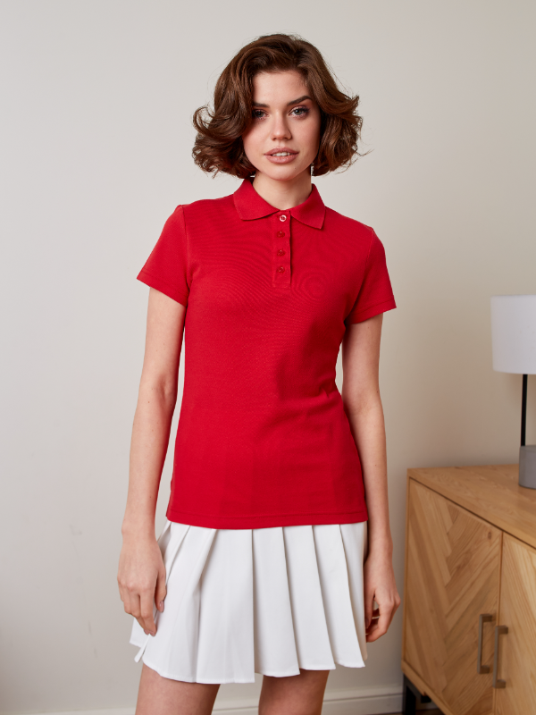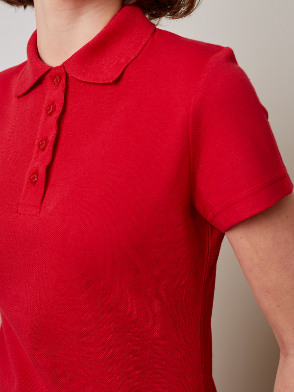 Женская рубашка поло приталенного силуэта с отложным воротником, втачным коротким рукавом и застежкой на пуговицы.