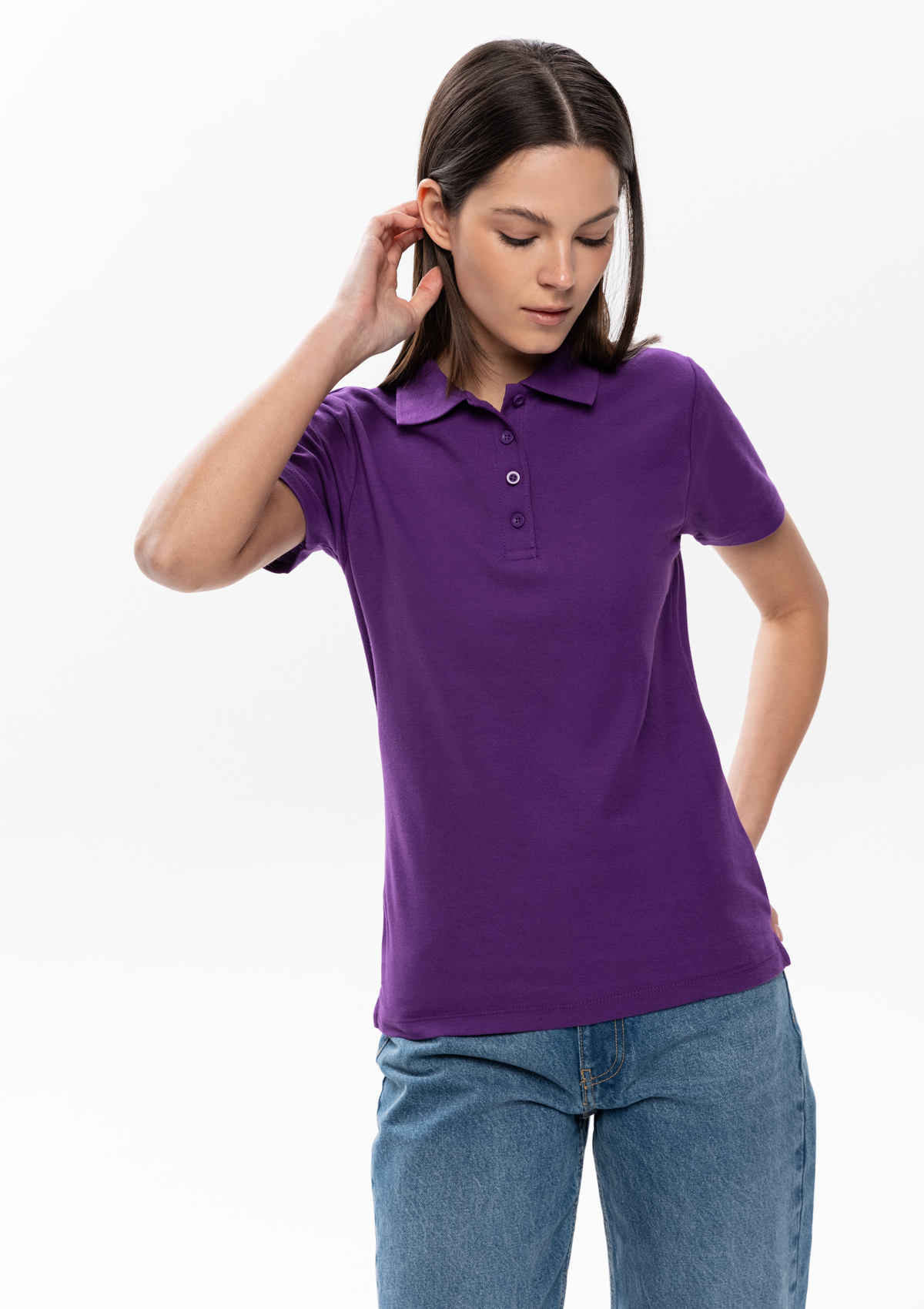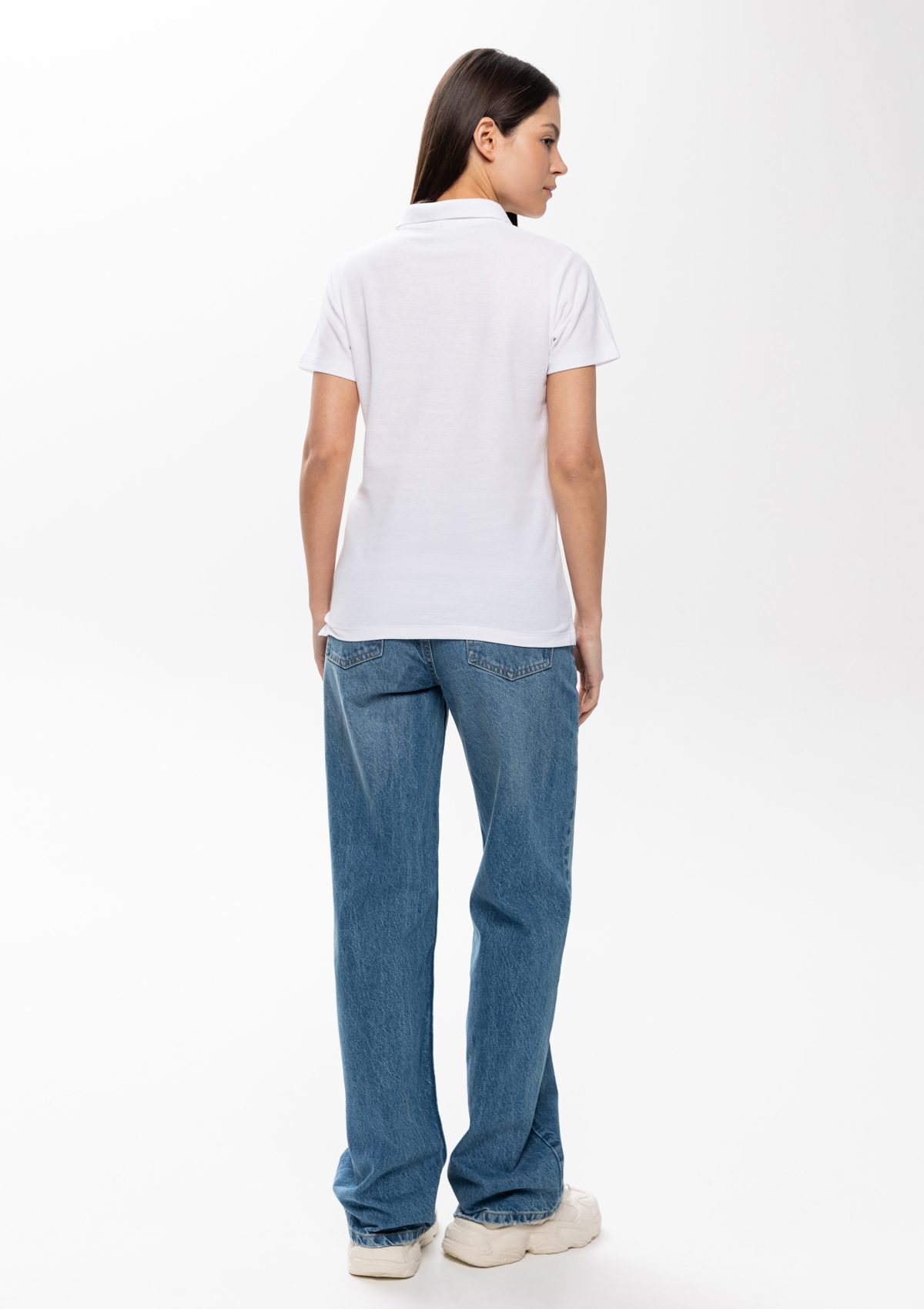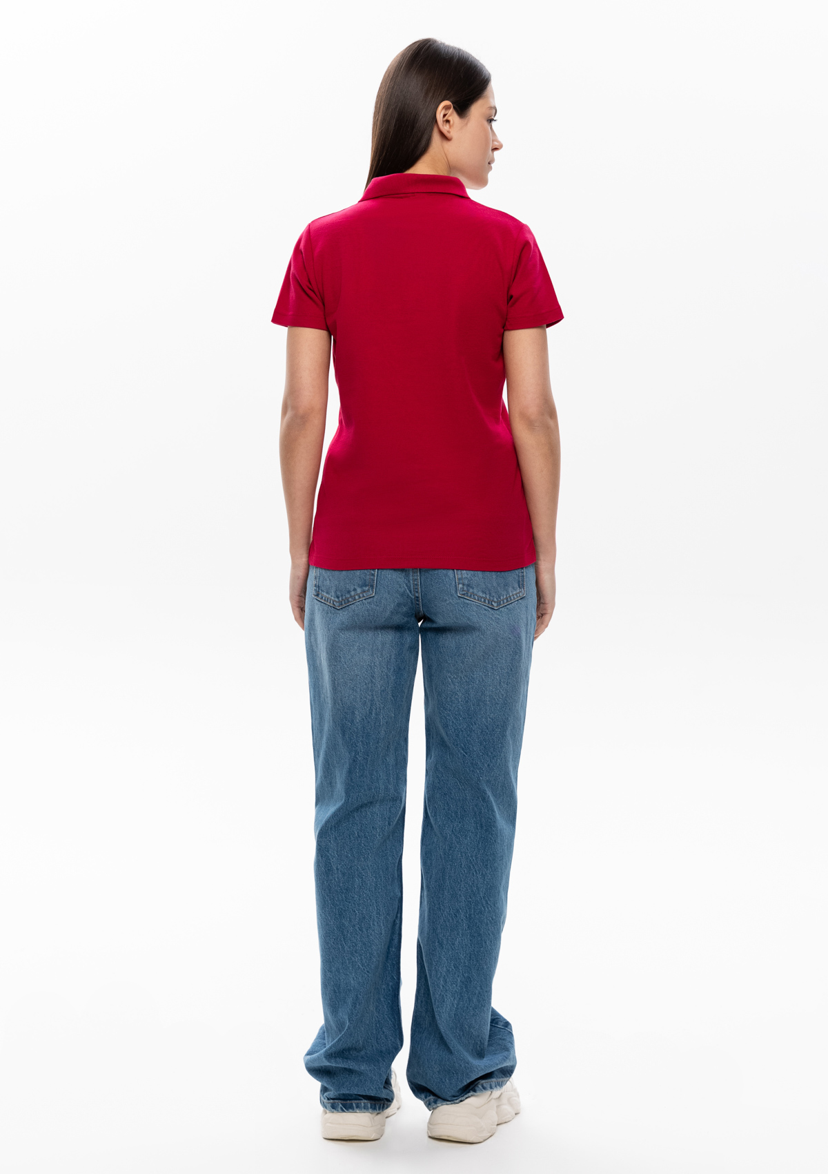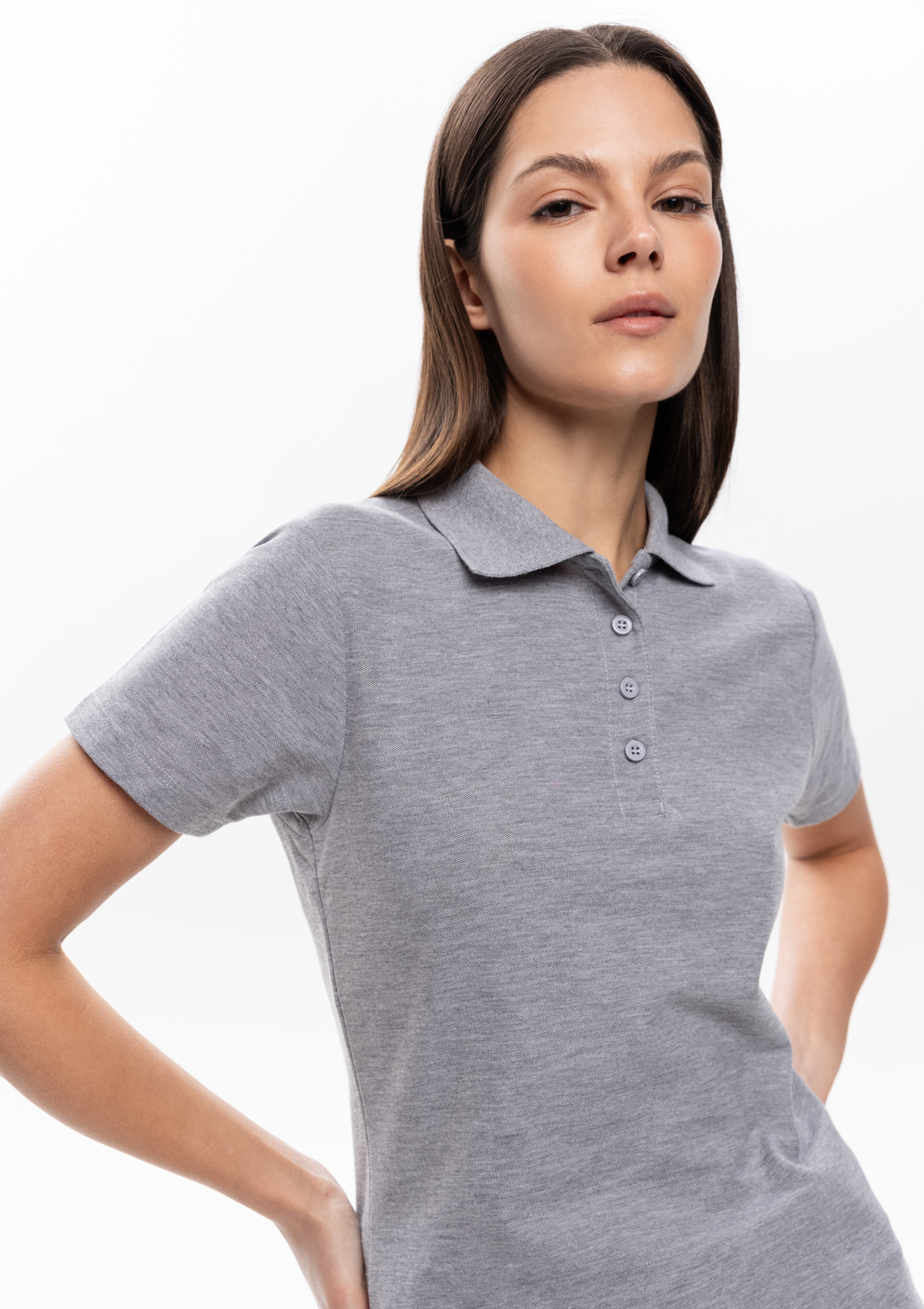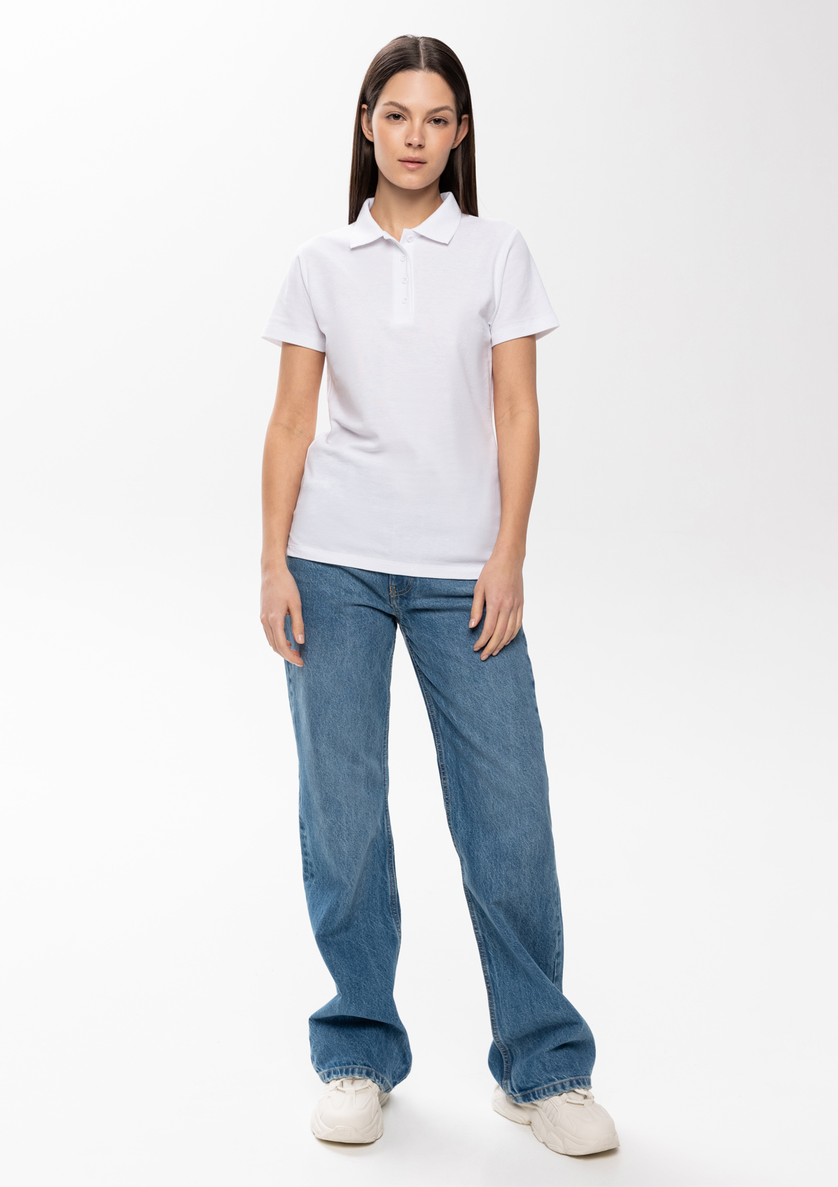 Женская рубашка поло приталенного силуэта с отложным воротником, втачным коротким рукавом и застежкой на пуговицы.