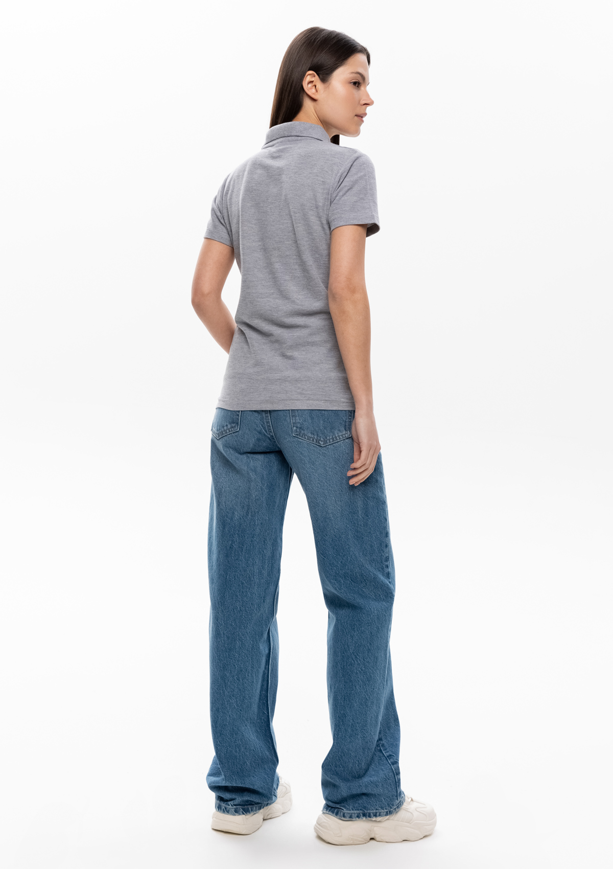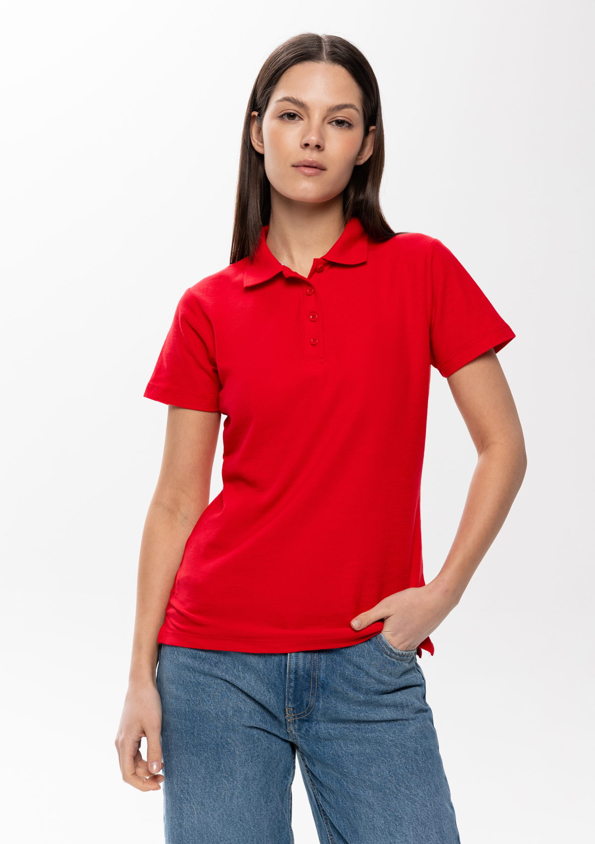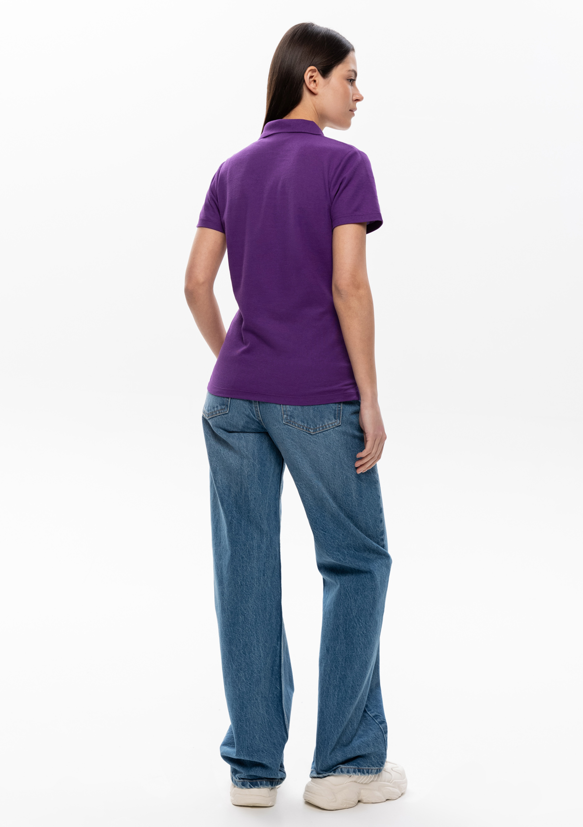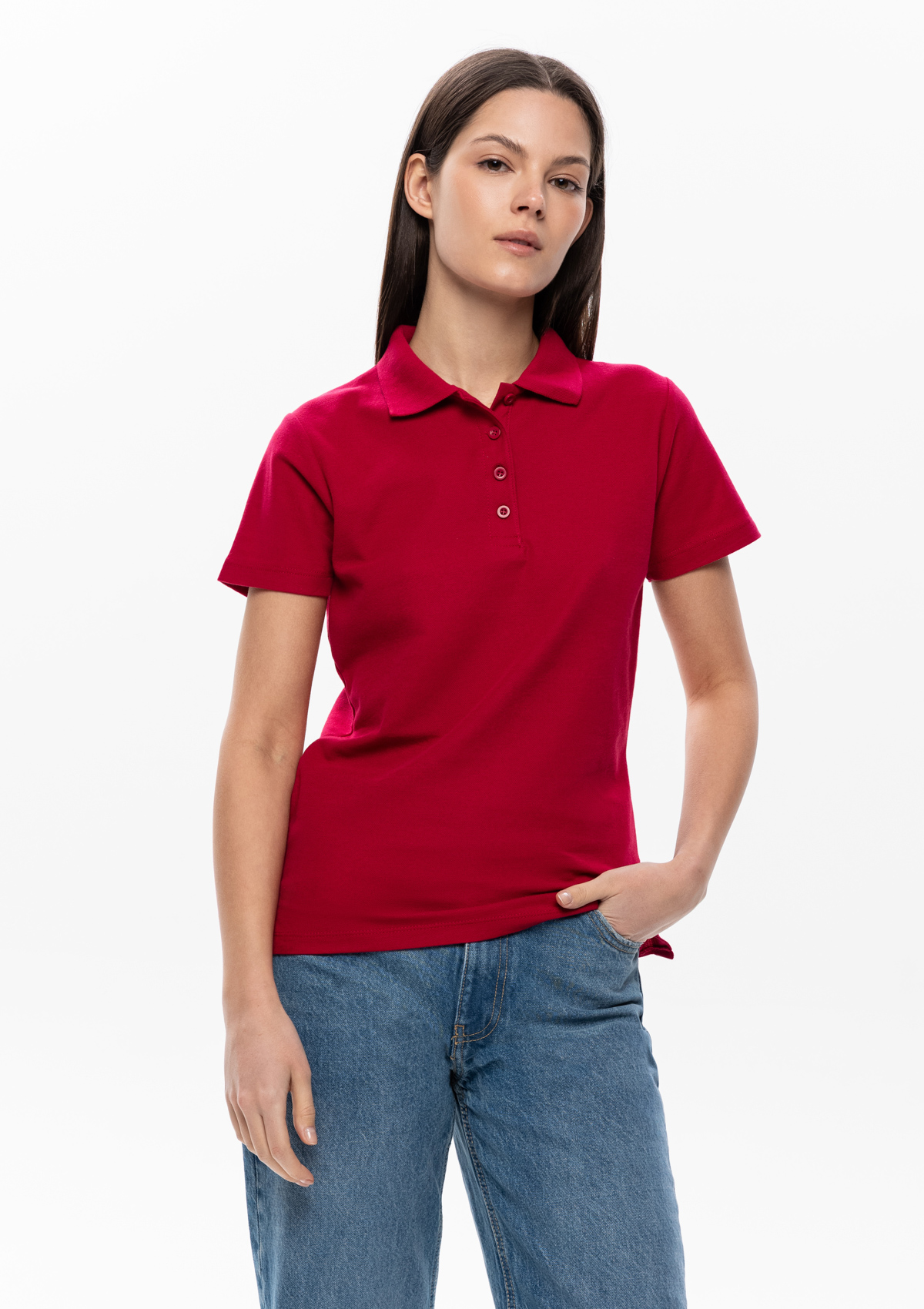 Женская рубашка поло приталенного силуэта с отложным воротником, втачным коротким рукавом и застежкой на пуговицы.