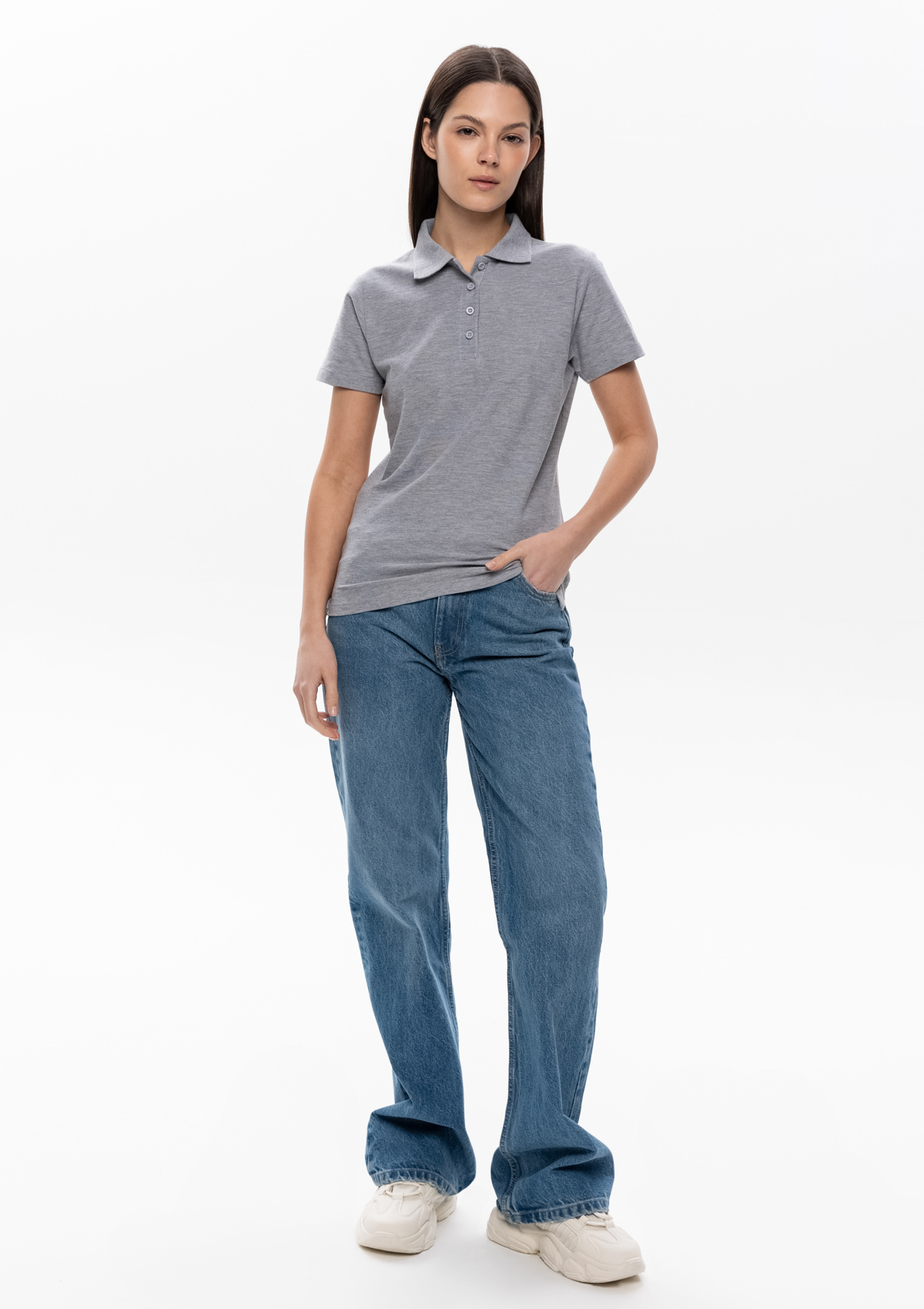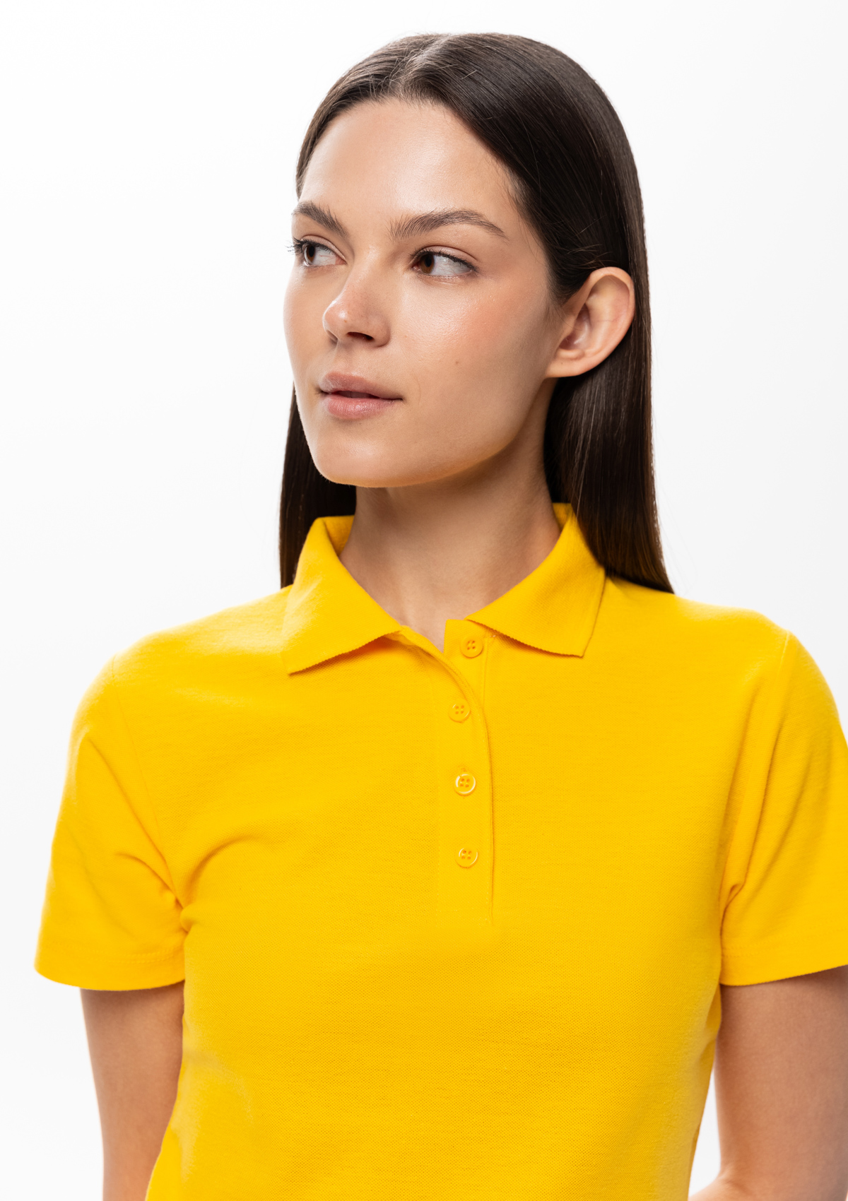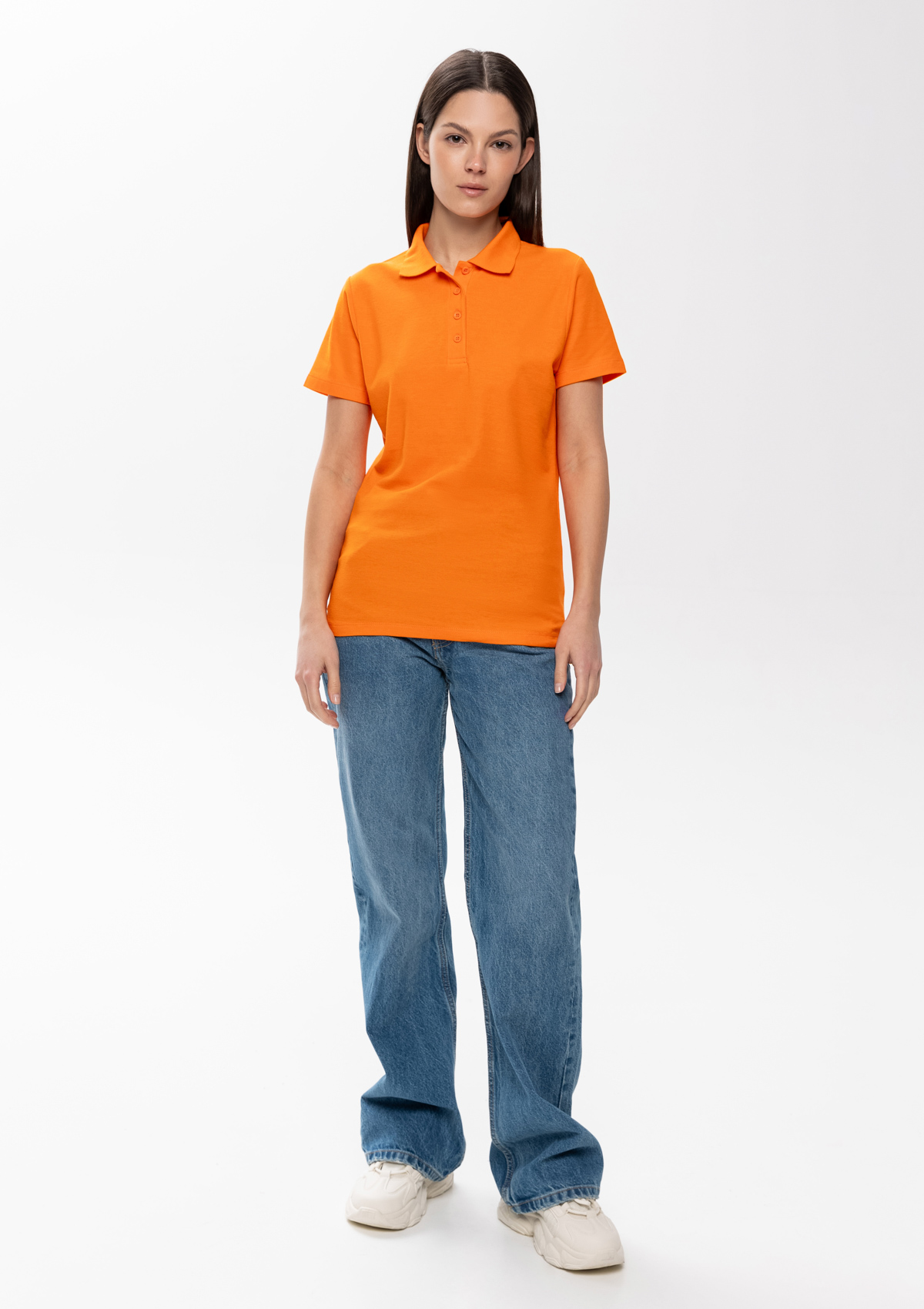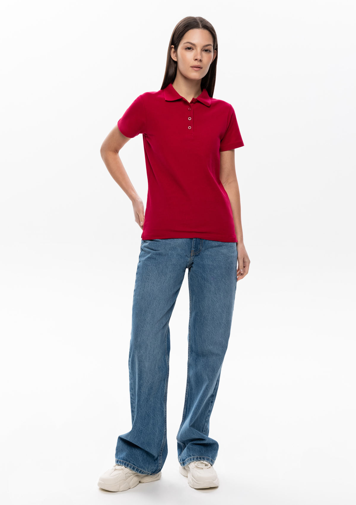 Женская рубашка поло приталенного силуэта с отложным воротником, втачным коротким рукавом и застежкой на пуговицы.