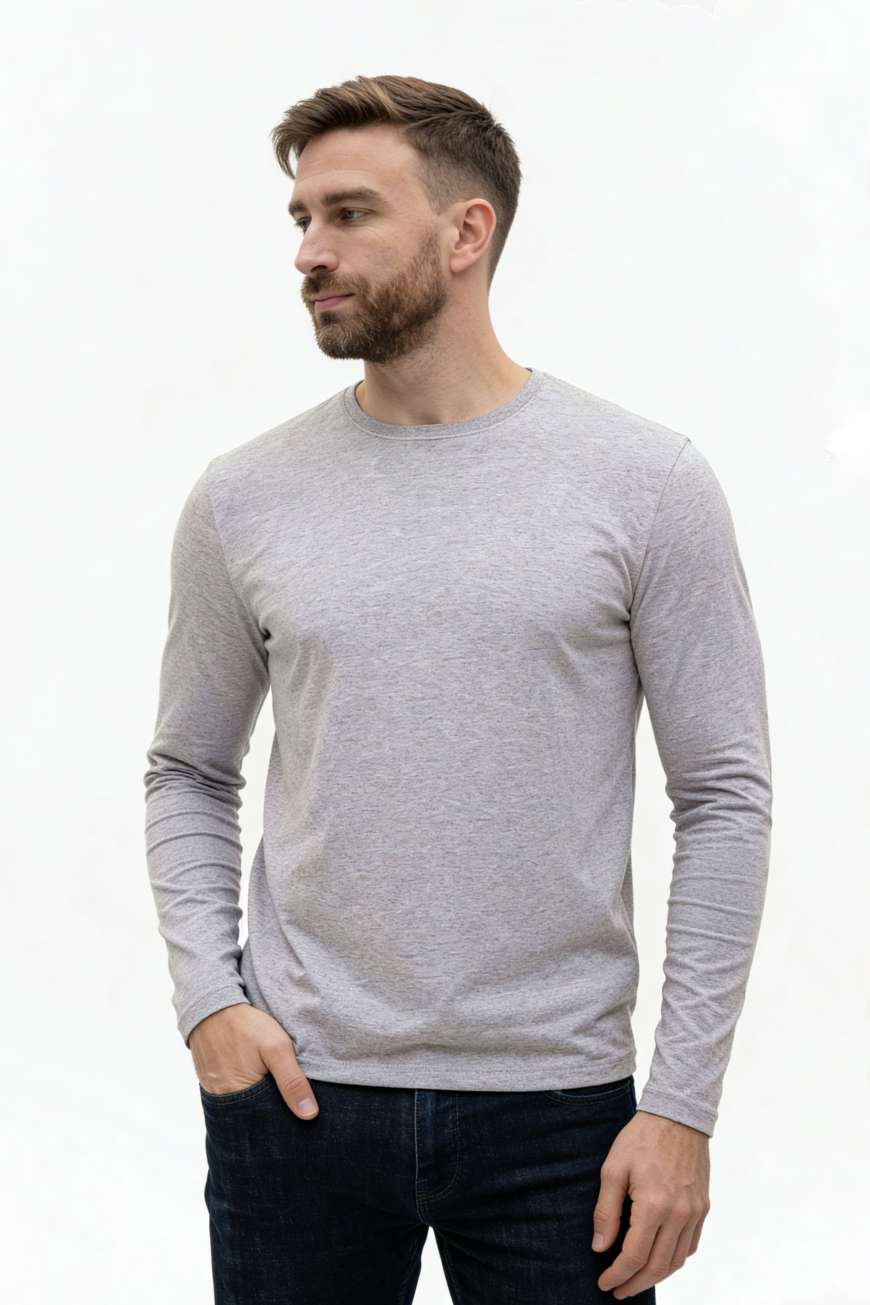 Универсальная футболка прямого силуэта с округлым воротом и длинным втачным рукавом. Плечевые швы и шов горловины усилены настрочной бейкой из основного полотна.