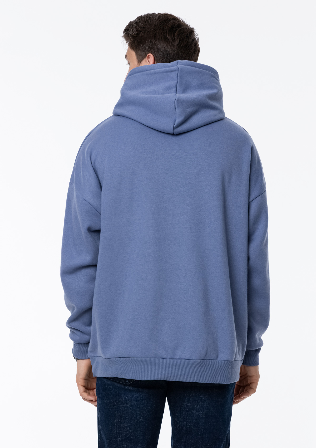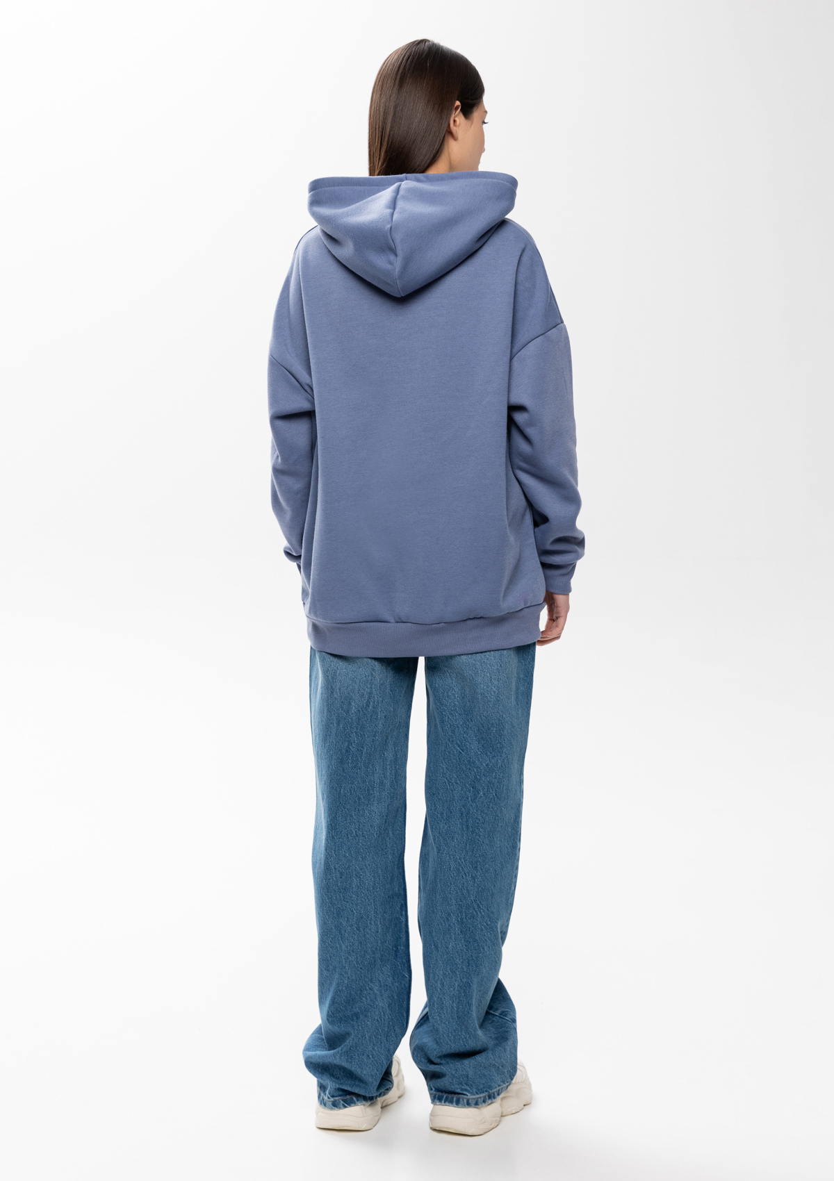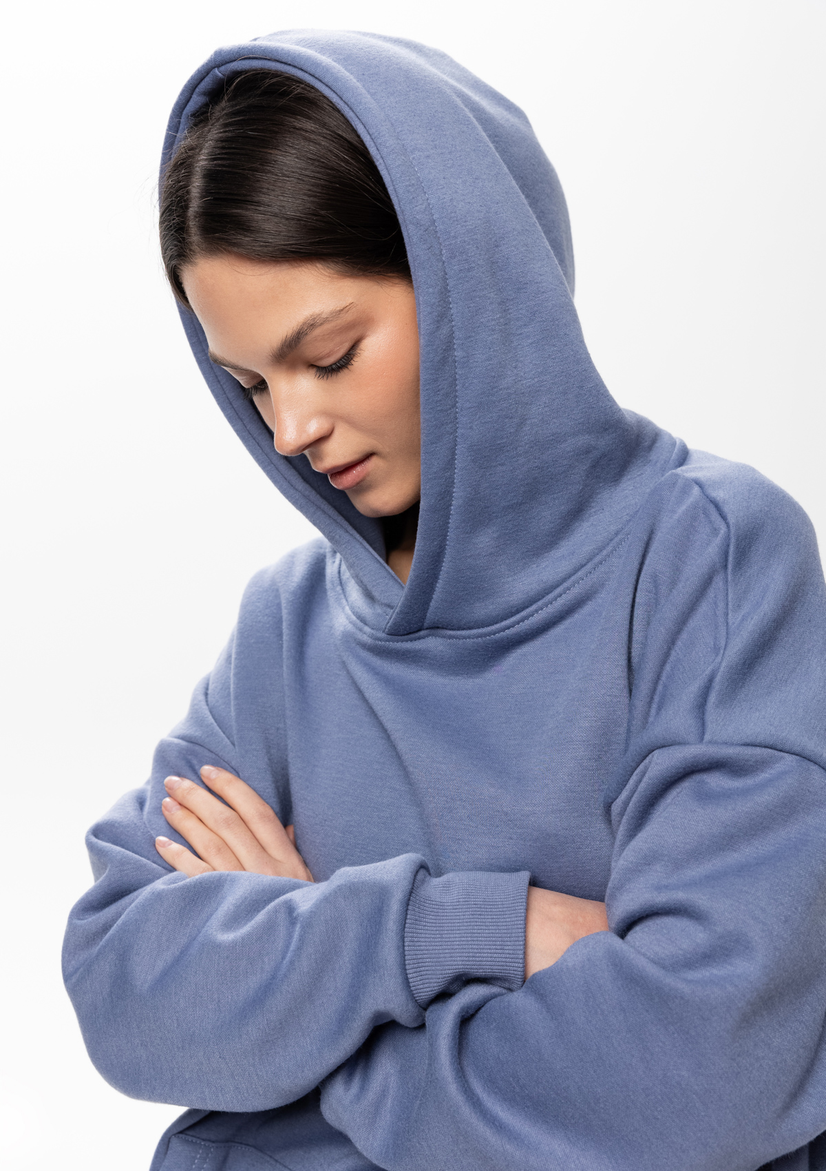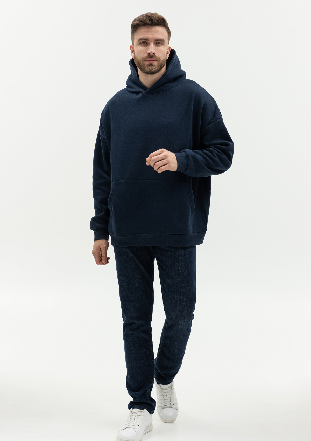 Толстовка свободного силуэта с капюшоном комфортной глубины, спущенной линией плеча и глубоким карманом-кенгуру. Манжет и низ изделия оформлены широкой эластичной резинкой в тон основному цвету.