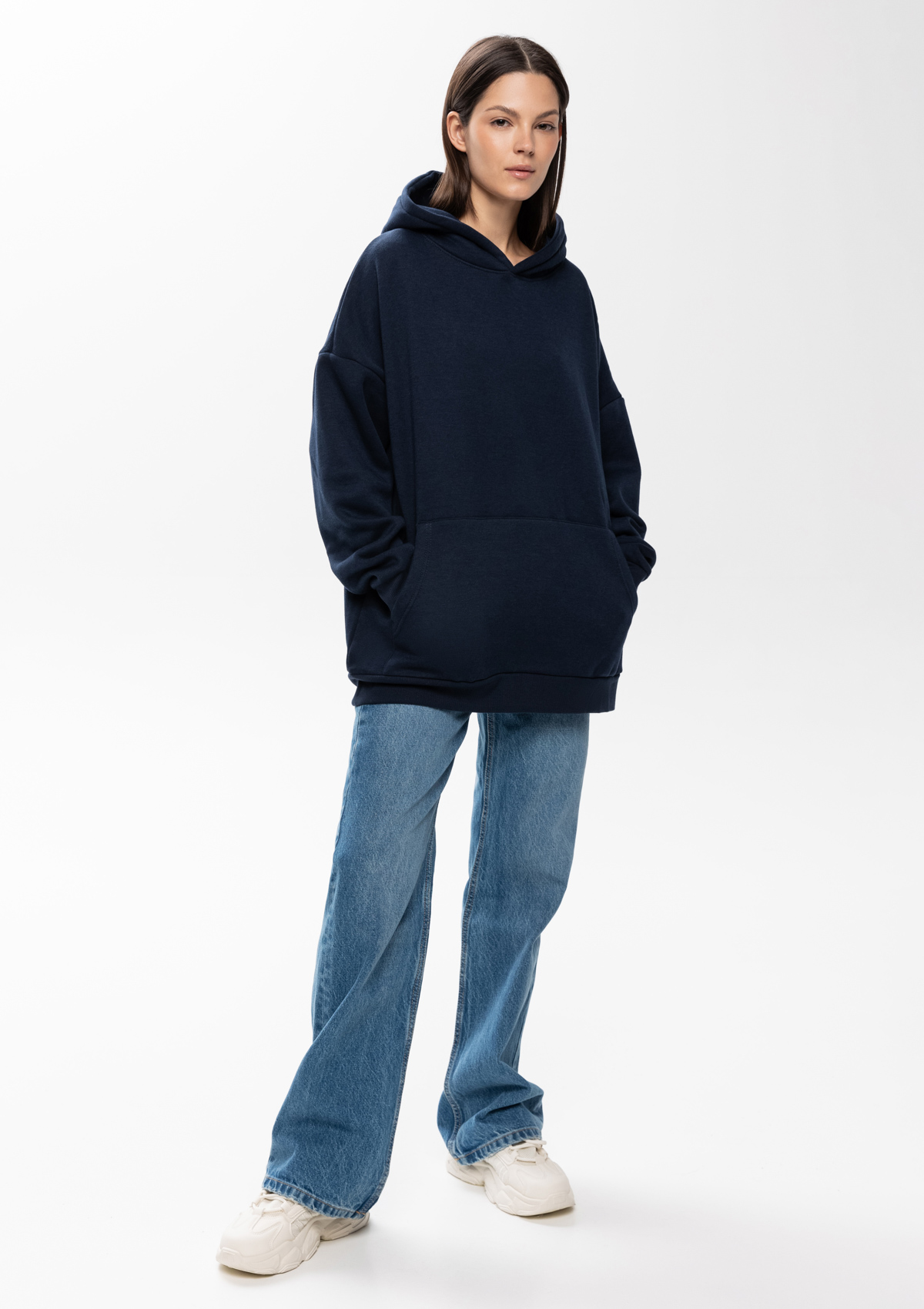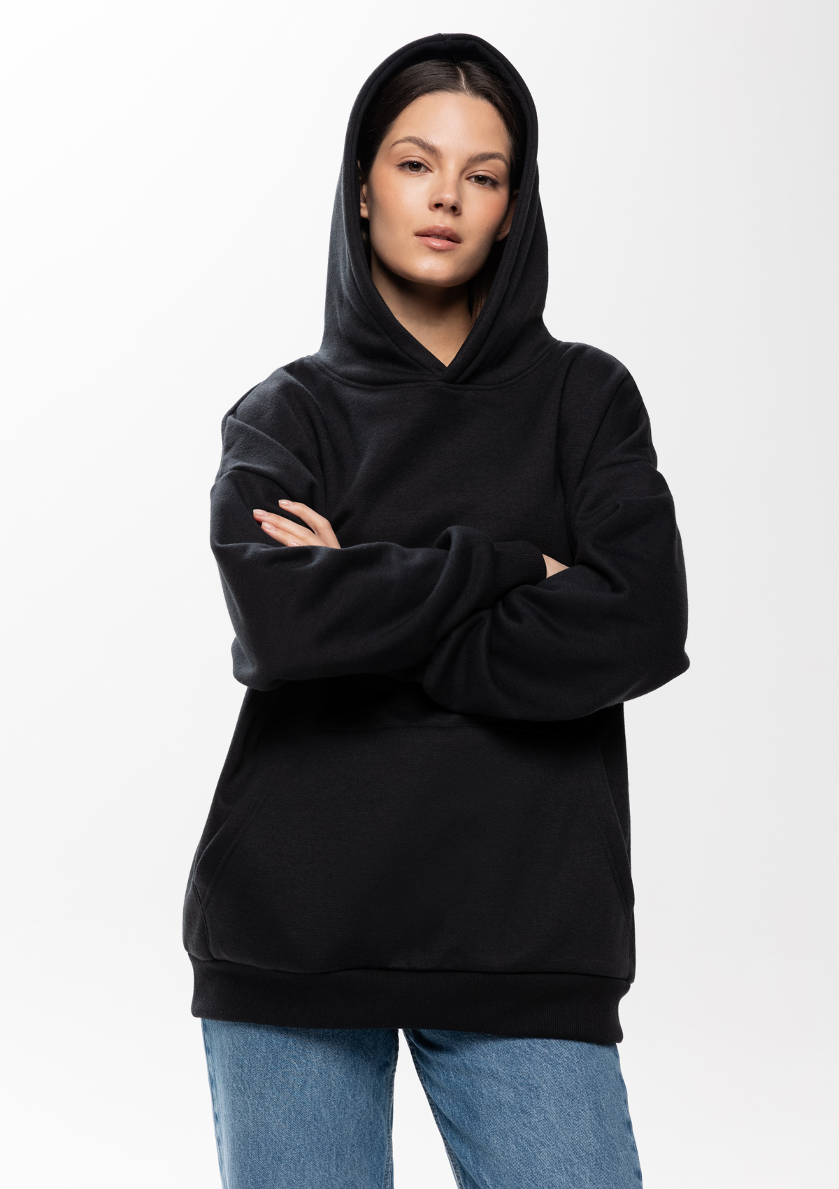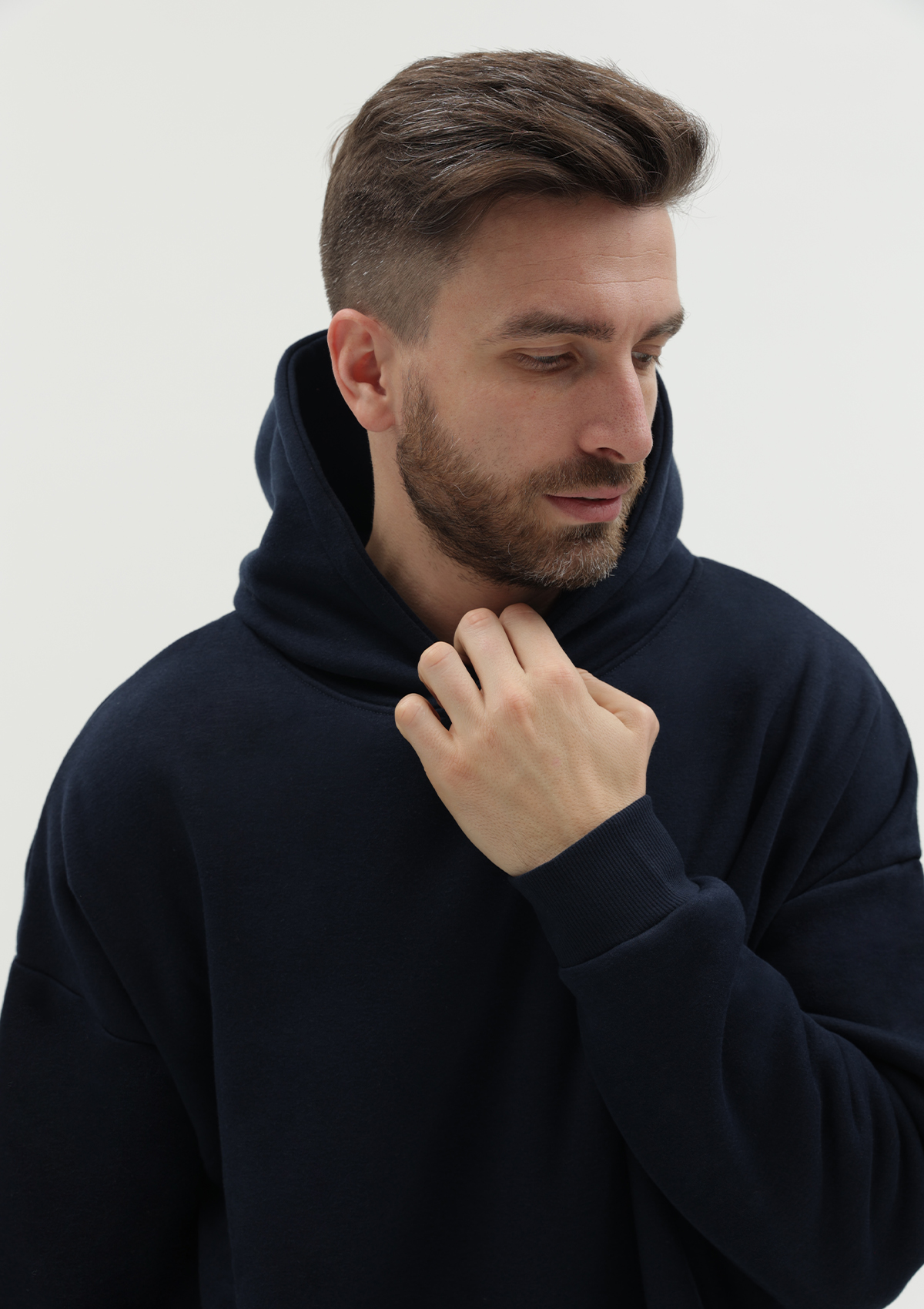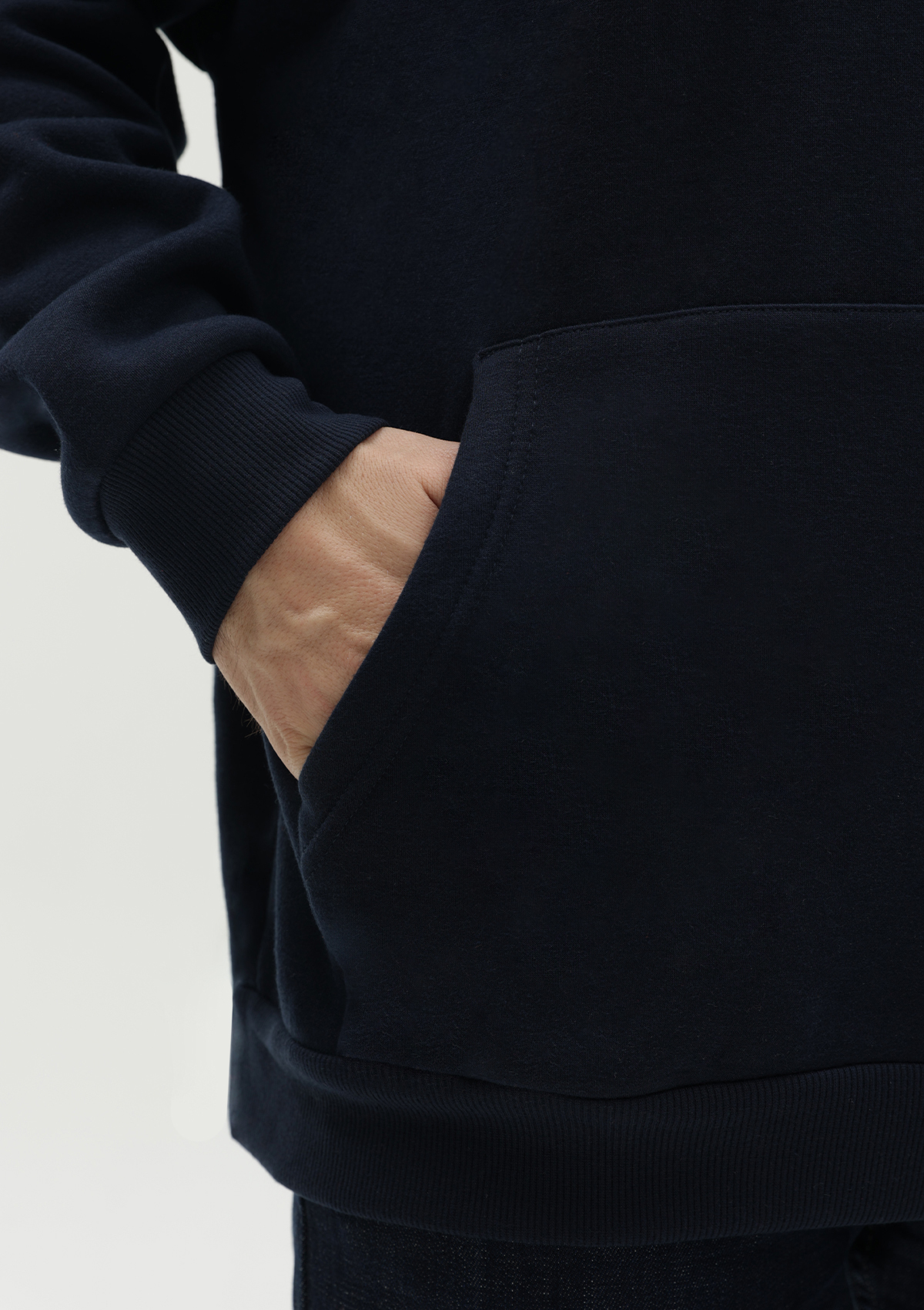 Толстовка свободного силуэта с капюшоном комфортной глубины, спущенной линией плеча и глубоким карманом-кенгуру. Манжет и низ изделия оформлены широкой эластичной резинкой в тон основному цвету.