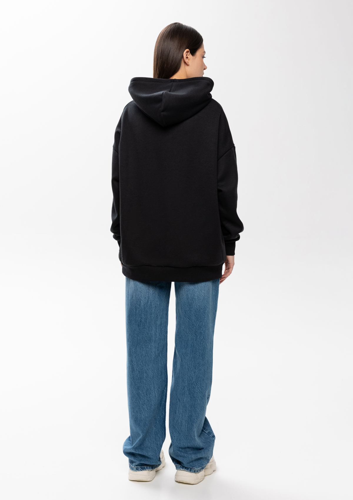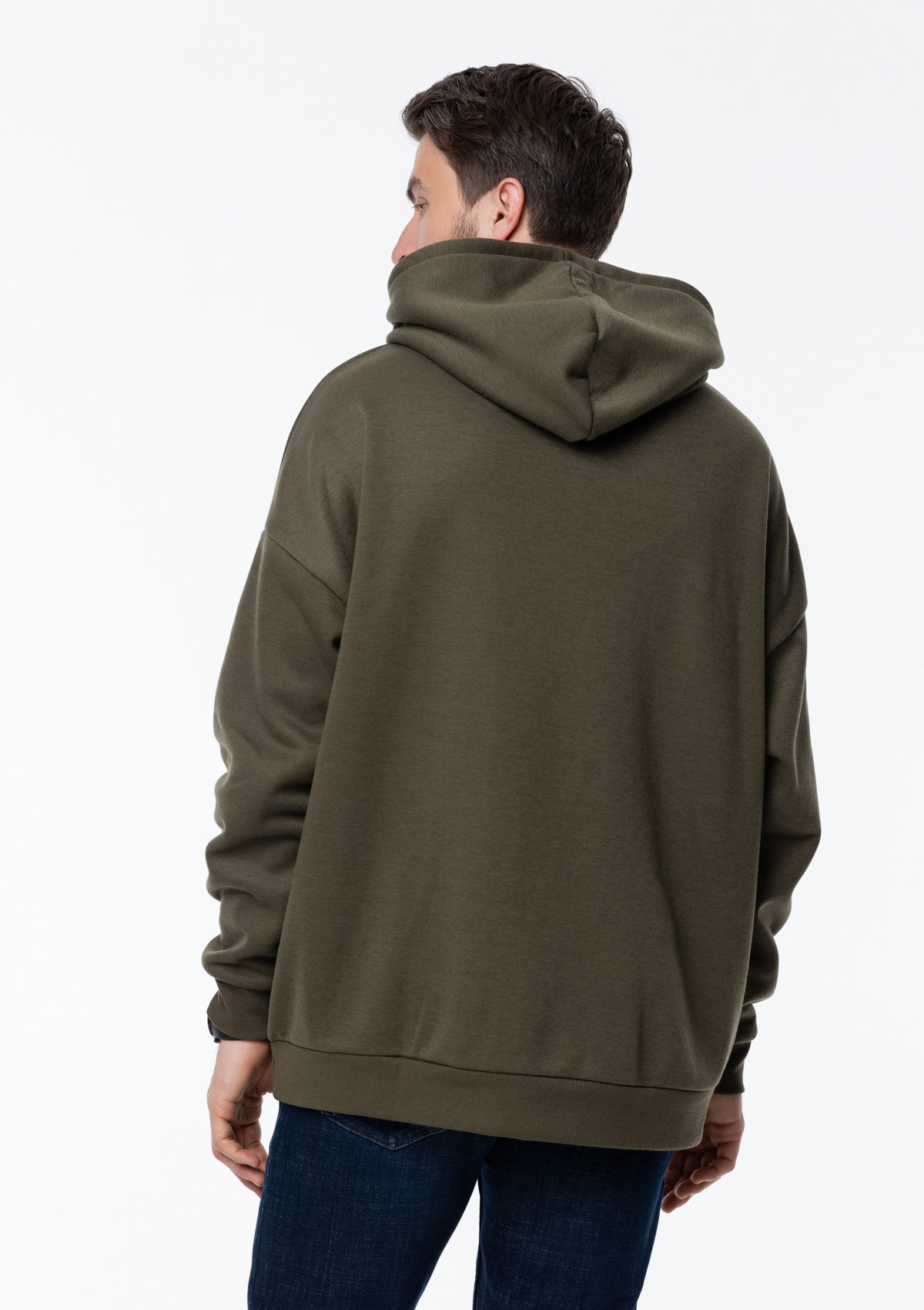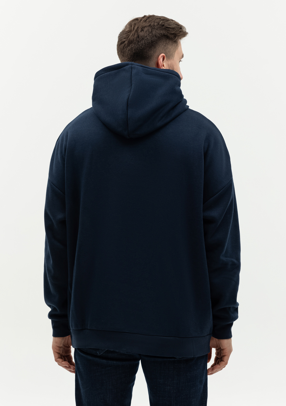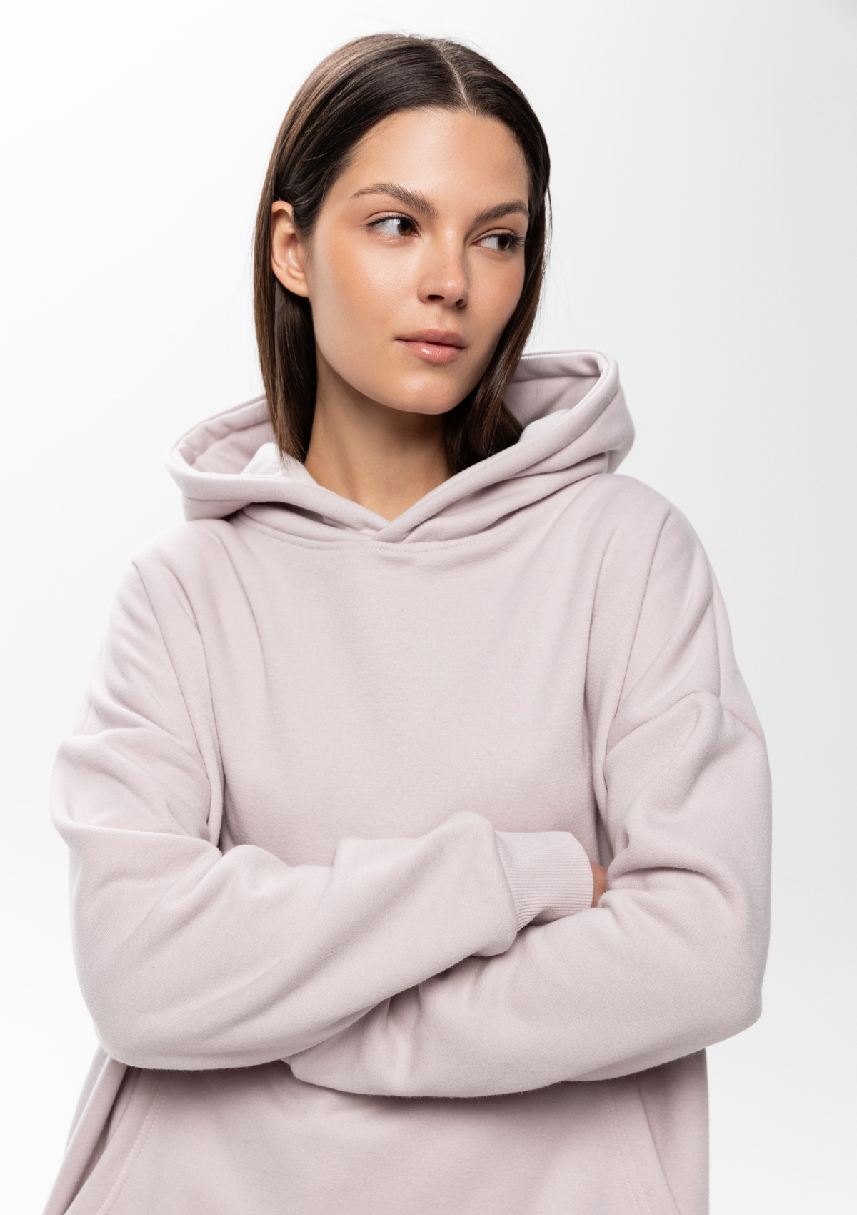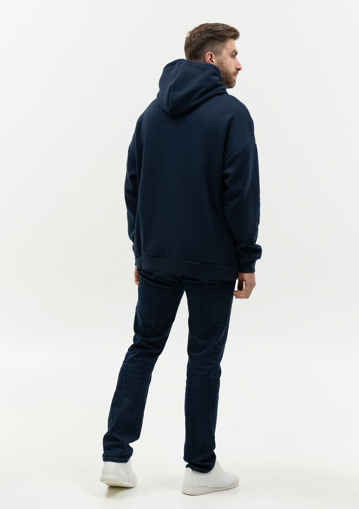 Толстовка свободного силуэта с капюшоном комфортной глубины, спущенной линией плеча и глубоким карманом-кенгуру. Манжет и низ изделия оформлены широкой эластичной резинкой в тон основному цвету.