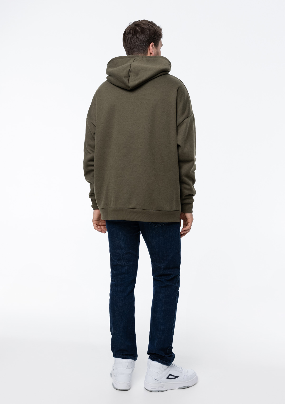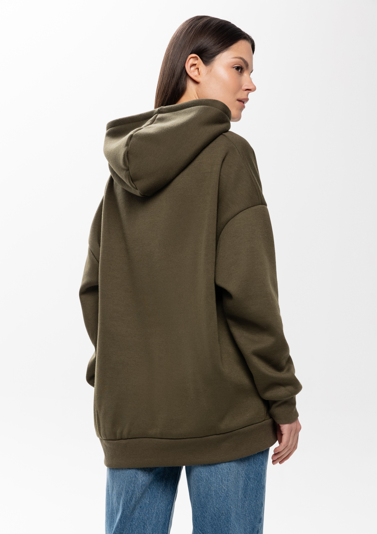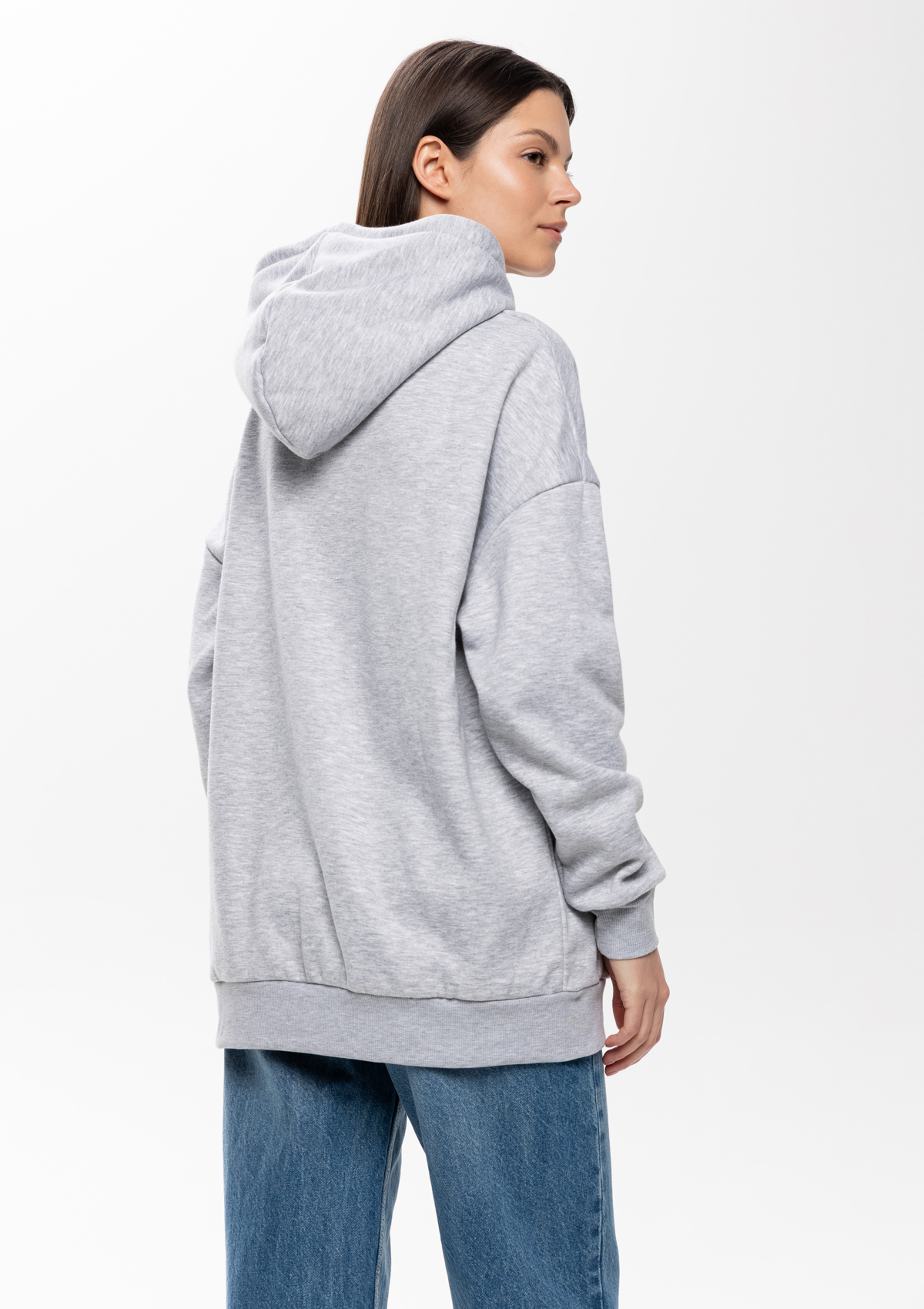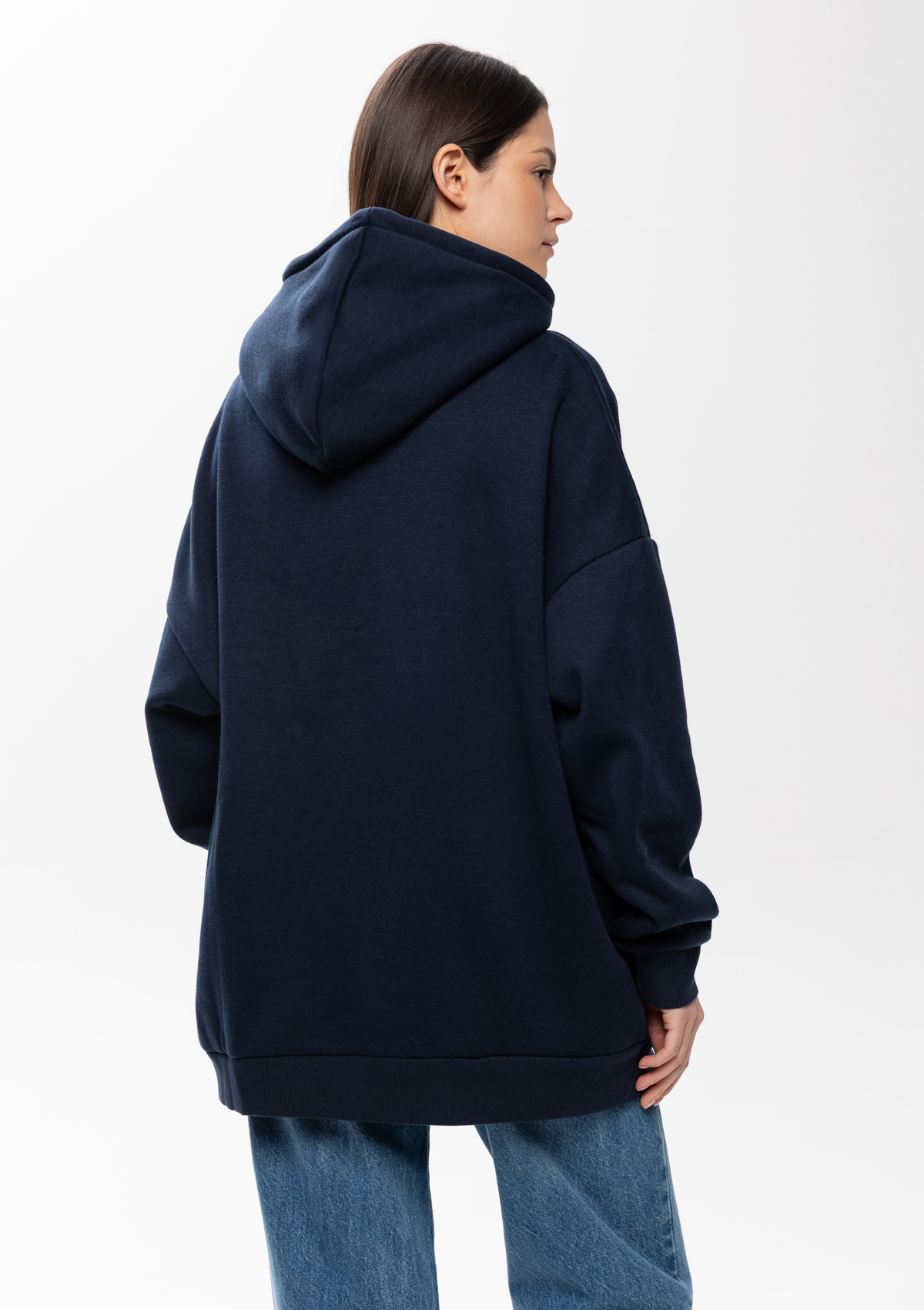 Толстовка свободного силуэта с капюшоном комфортной глубины, спущенной линией плеча и глубоким карманом-кенгуру. Манжет и низ изделия оформлены широкой эластичной резинкой в тон основному цвету.