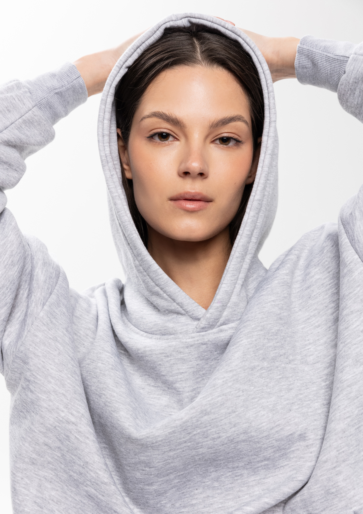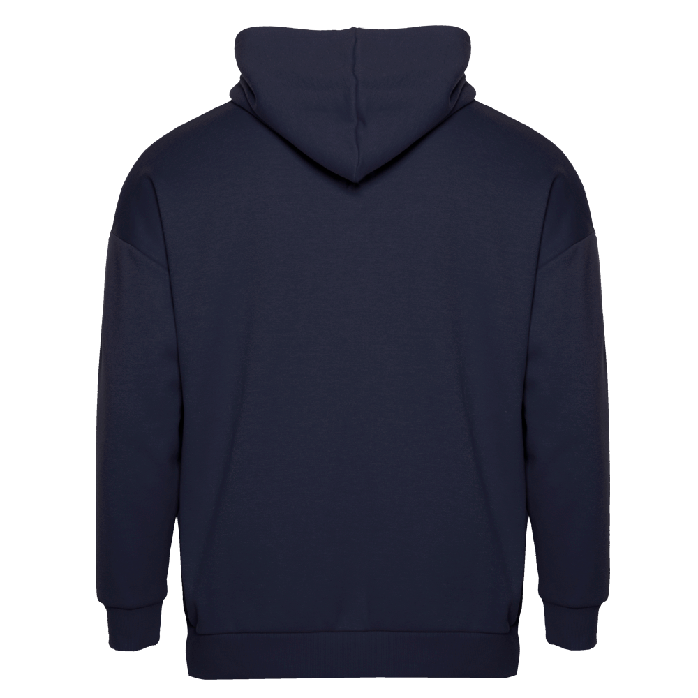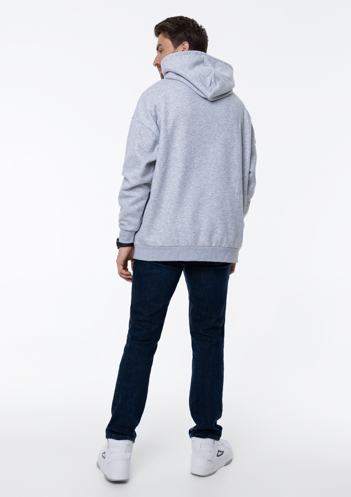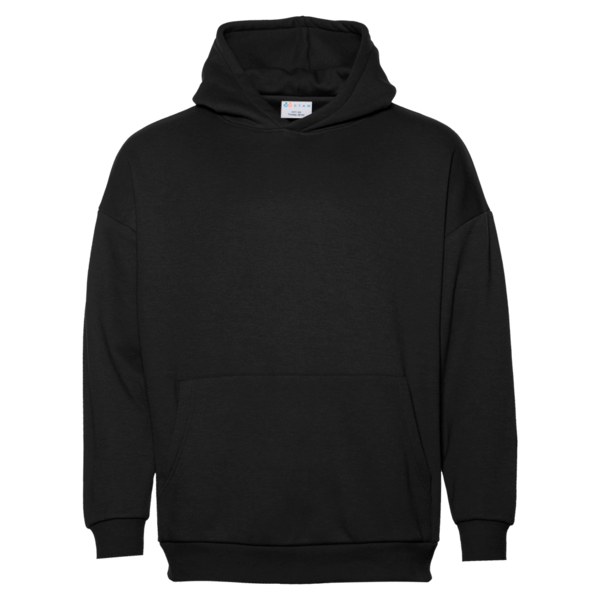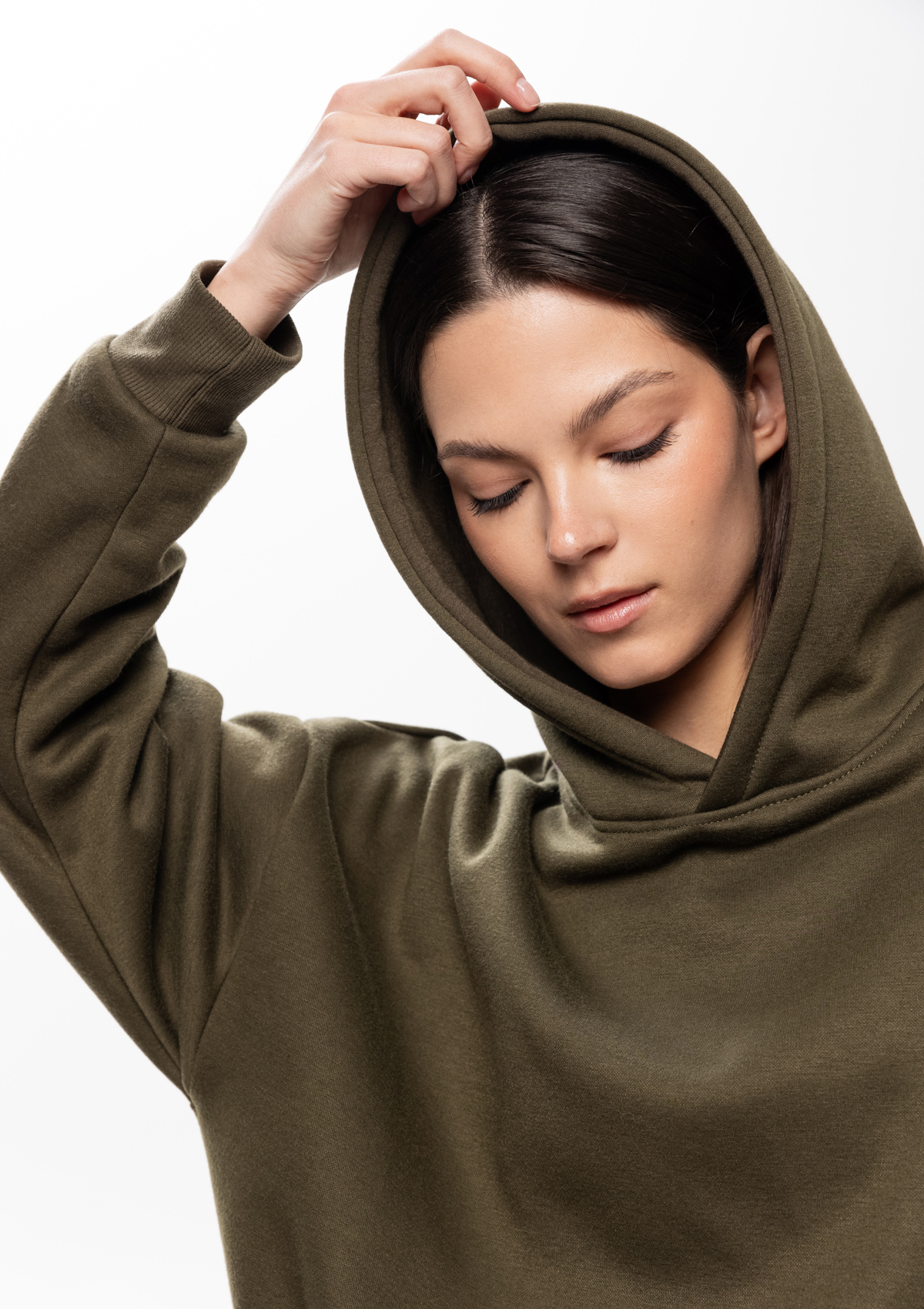 Толстовка свободного силуэта с капюшоном комфортной глубины, спущенной линией плеча и глубоким карманом-кенгуру. Манжет и низ изделия оформлены широкой эластичной резинкой в тон основному цвету.