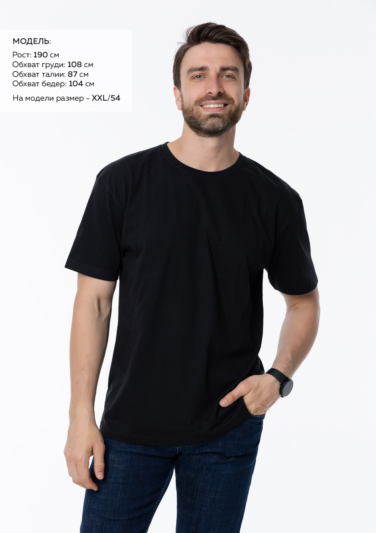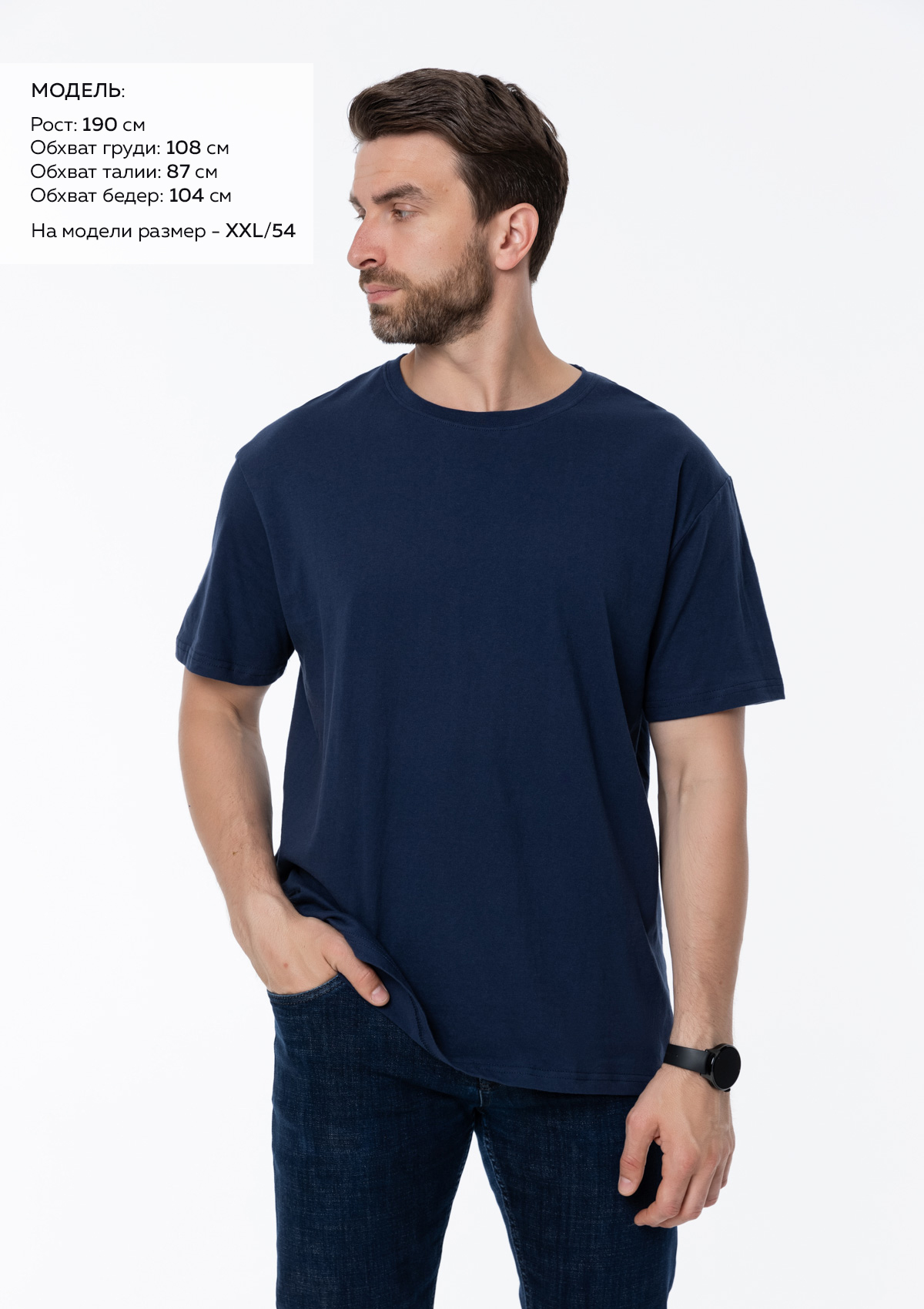 Размер мужской футболки: XXL/54. Параметры модели: рост 190 см.; обхват груди 108 см.; обхват талии 87 см.; обхват бедер 104 см.