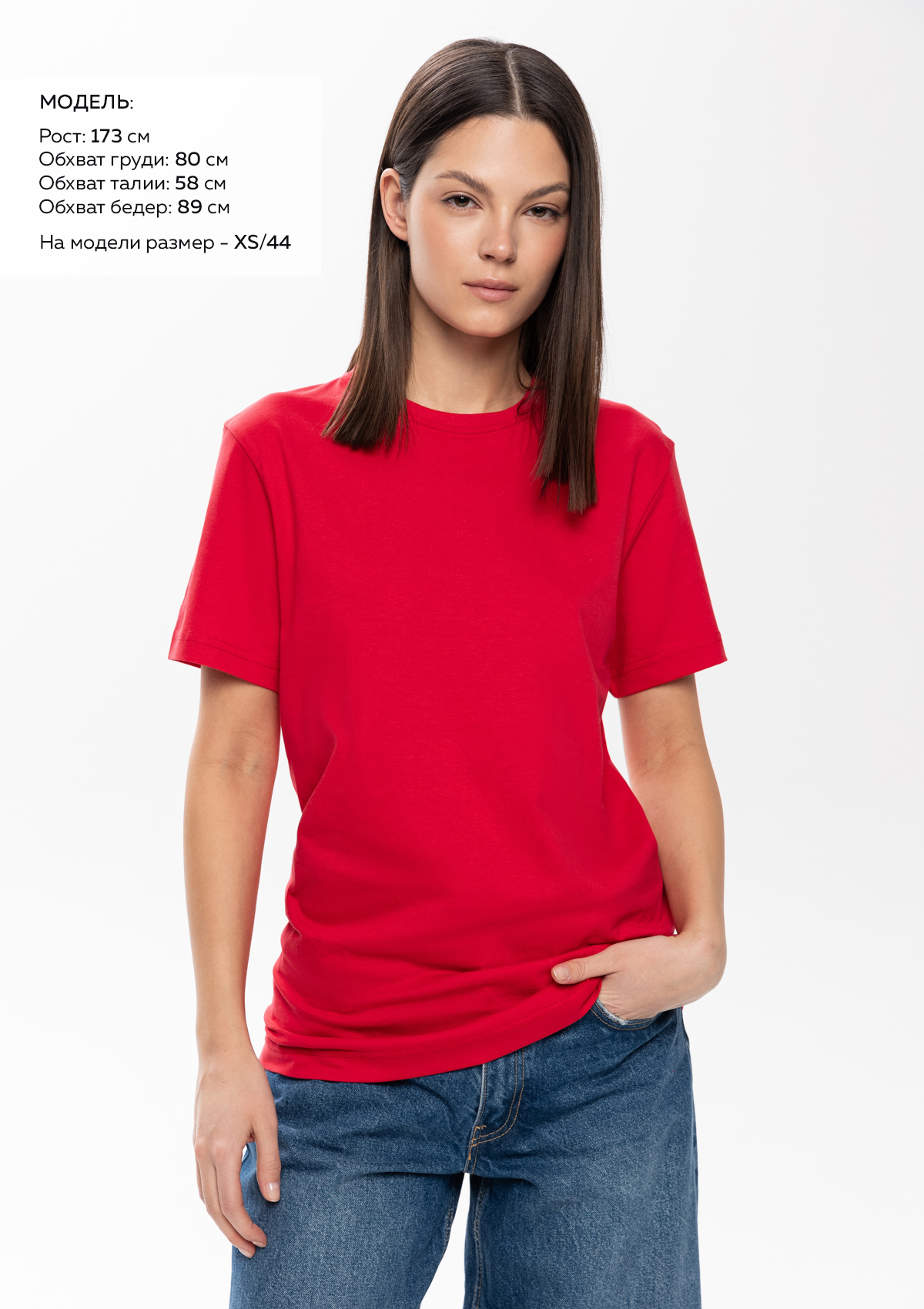 Размер женской футболки: XS/44. Параметры модели: рост 173 см.; обхват груди 80 см.; обхват талии 58 см.; обхват бедер 89 см.