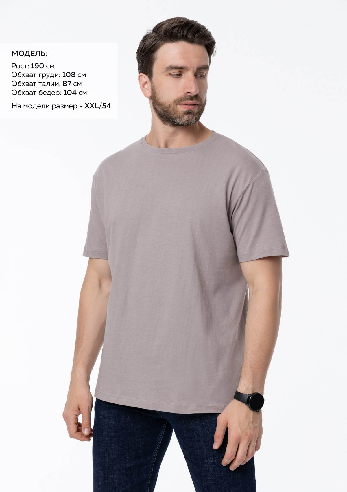 Размер мужской футболки: XXXL/56. Параметры модели: рост 190 см.; обхват груди 108 см.; обхват талии 87 см.; обхват бедер 104 см.