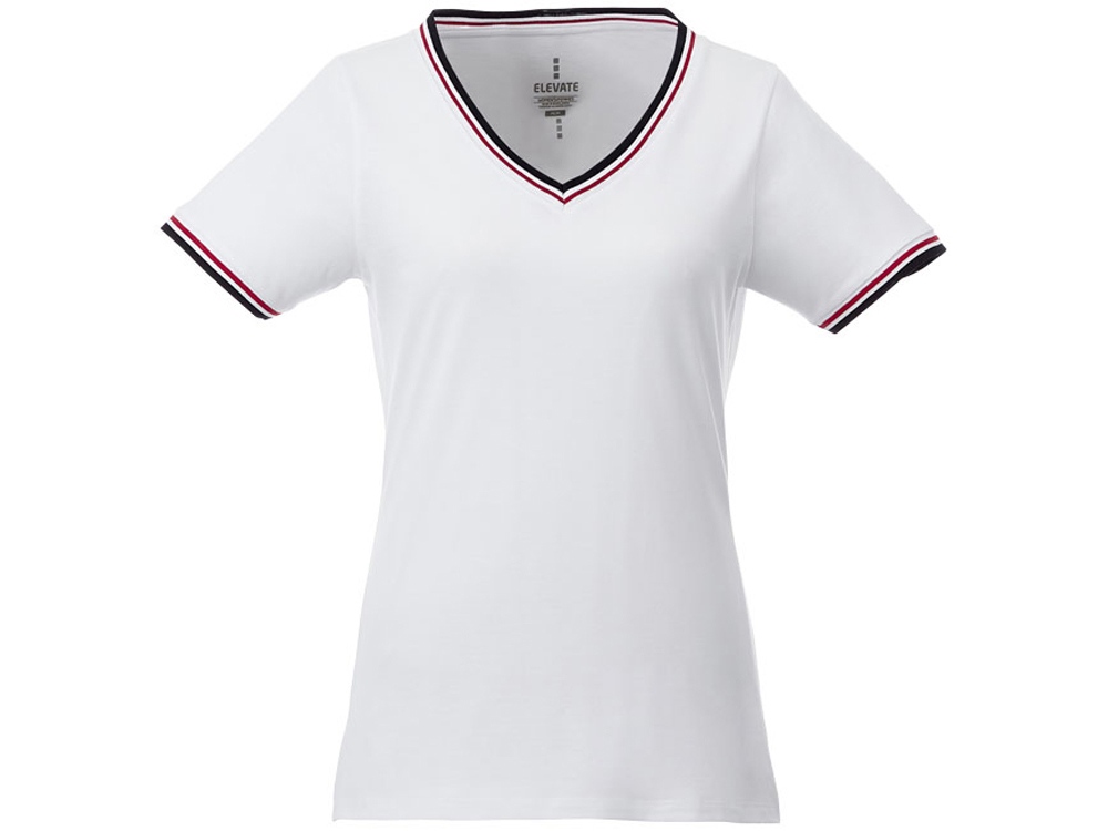 Женская футболка Elbert с коротким рукавом. Воротник гладкой вязкой в рубчик. Манжеты гладкой вязкой в рубчик. Контрастные окантовки.V-образная горловина. Двойная строчка на воротнике и внизу изделия. Комфортный ярлык-трансфер на изделии. Трикотажное пике, 100% хлопок. 180 г/м².
