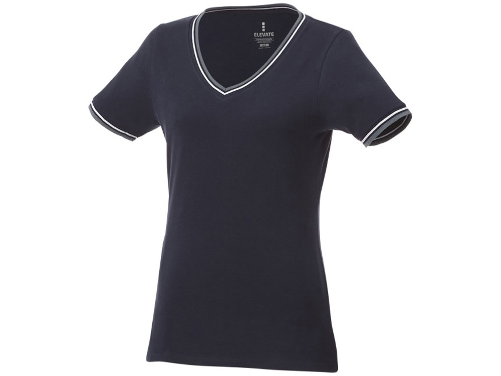 Женская футболка Elbert с коротким рукавом. Воротник гладкой вязкой в рубчик. Манжеты гладкой вязкой в рубчик. Контрастные окантовки.V-образная горловина. Двойная строчка на воротнике и внизу изделия. Комфортный ярлык-трансфер на изделии. Трикотажное пике, 100% хлопок. 180 г/м².