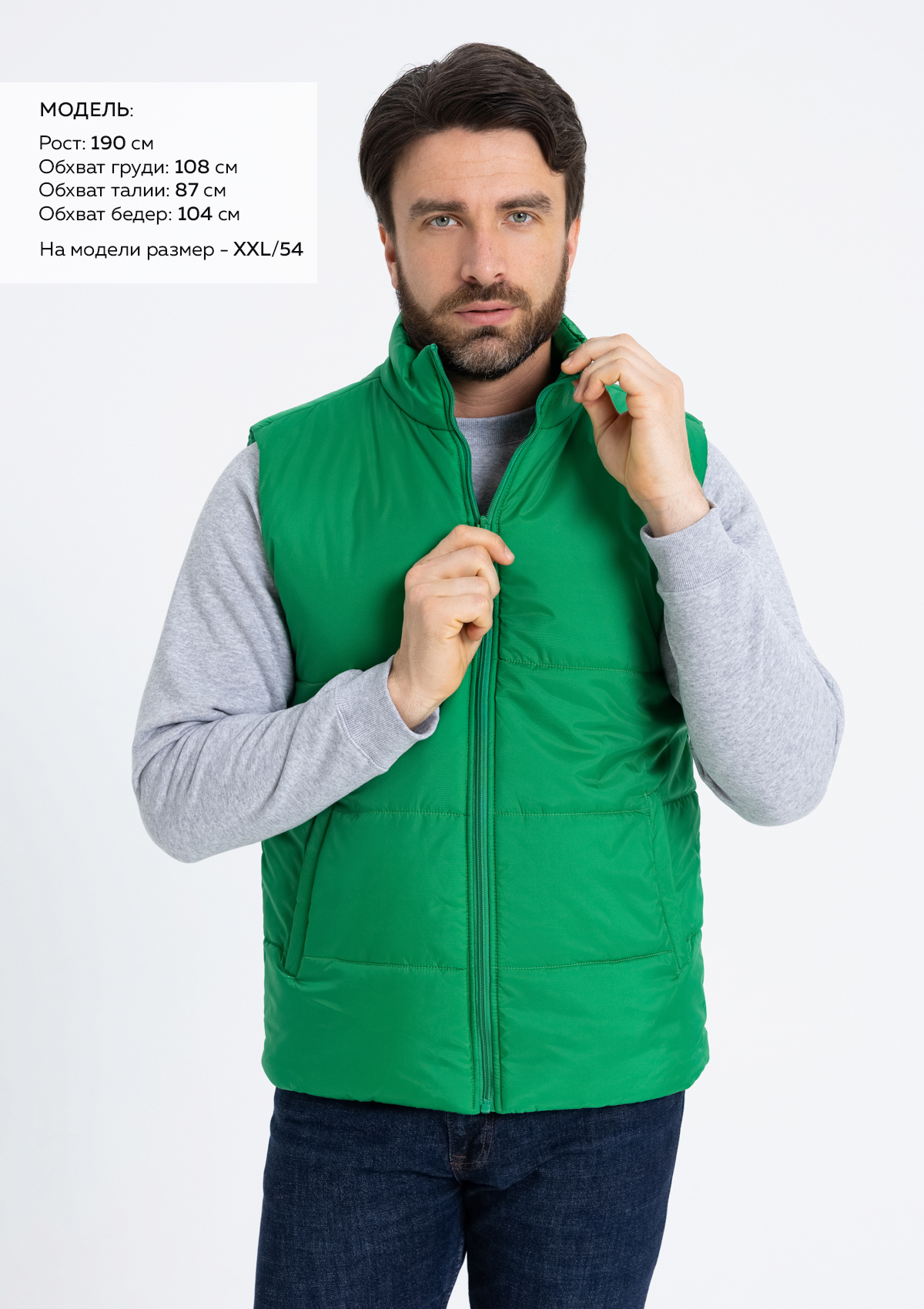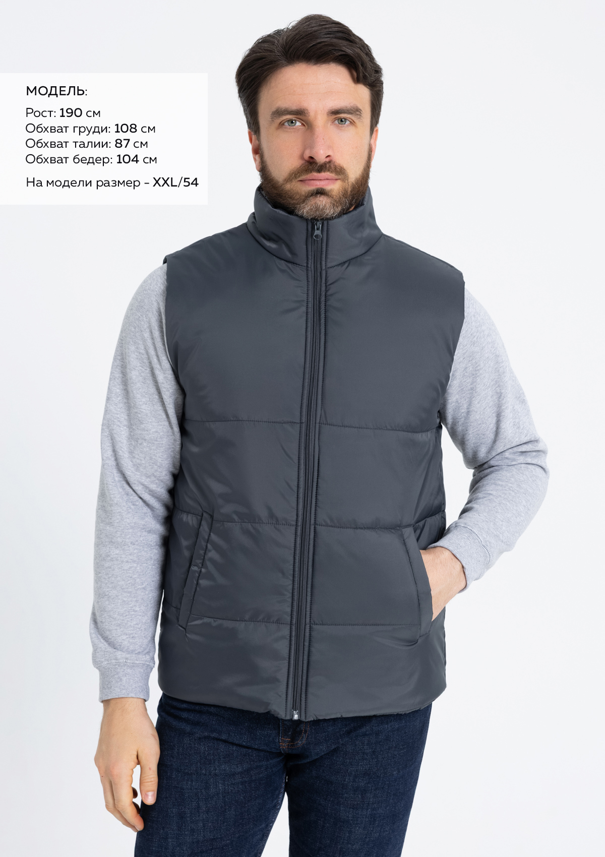 Размер на модели: XXL/54. Параметры модели: рост 190 см.; обхват груди 108 см.; обхват талии 87 см.; обхват бедер 104 см.