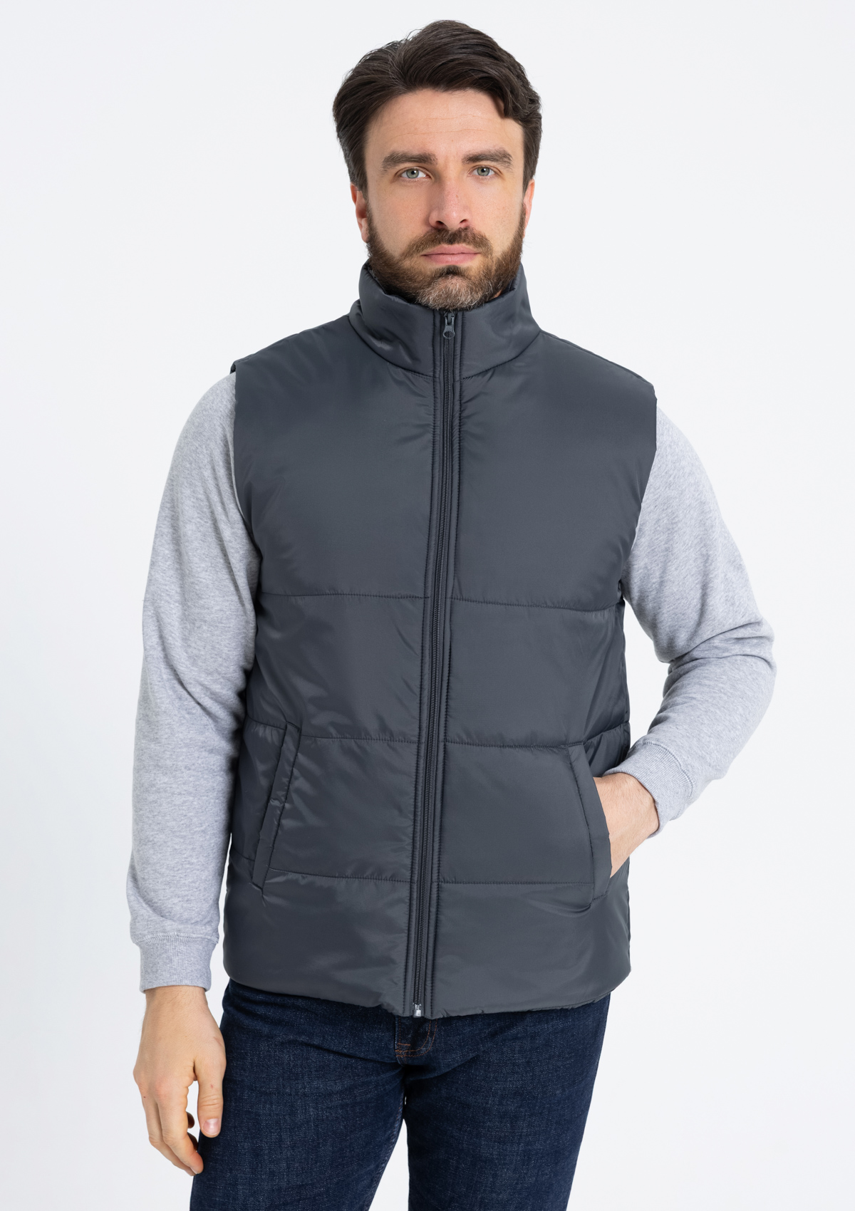 Универсальный жилет прямого силуэта с широкой горизонтальной стежкой, высоким воротником-стойкой, глубоким прорезным карманом и застежкой на молнию. Благодаря классическому лаконичному крою модель станет стильным дополнением как к мужскому, так и к женскому гардеробу.